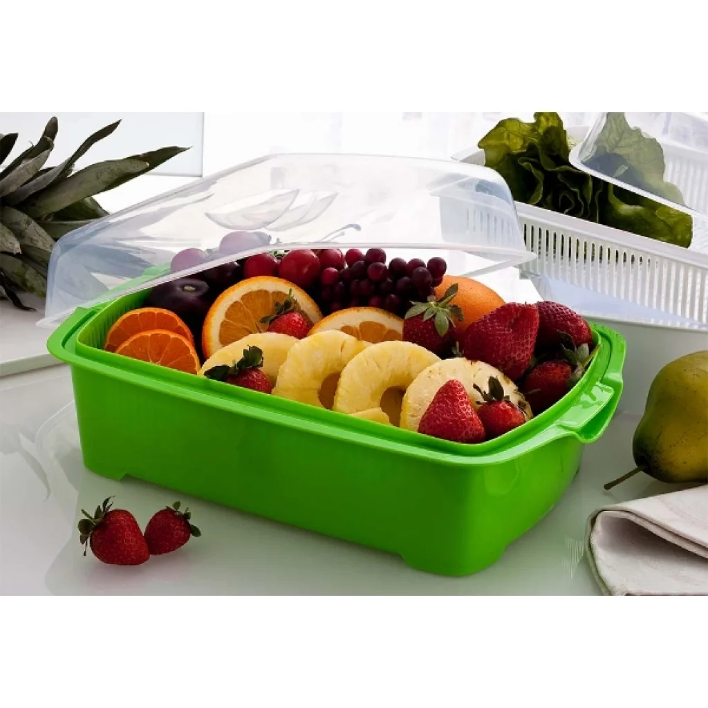 KAPAKLI SÜZGEÇ VE ÇOK AMAÇLI SAKLAMA KABIÜrün ÖzellikleriKapaklı Süzgeç, mutfakta hem hazırlık hem de saklama süreçlerini kolaylaştırmak için tasarlanmış çok fonksiyonlu bir yardımcıdır. Canlı renkli gövde tasarımı ve kristal berraklığındaki şeffaf kapak yapısı sayesinde içeriği dışarıdan kolayca görmenizi sağlar. Ürünün iç kısmında yer alan ızgaralı süzgeç bölmesi, yıkanan sebze, meyve veya ekmek gibi gıdaların suyla temasını keserek daha uzun süre taze kalmasına yardımcı olur. Hava sirkülasyonuna izin veren tasarımı, özellikle unlu mamullerin nemlenmesini önleyerek çıtırlığını korumasını sağlar. Şık ve modern tasarımıyla sadece bir süzgeç değil, aynı zamanda servis ve sunum kabı olarak da kullanılabilir. Dayanıklı, sağlığa uygun plastik materyalden üretilen bu kapaklı süzgeç, darbelere karşı dirençlidir ve mutfak tezgahınızda veya dolap içlerinizde düzenli bir görünüm yaratır. Kolayca temizlenebilir yapısı ve ergonomik formuyla günlük mutfak işlerinizin vazgeçilmez bir parçası olacak.Ürün Teknik ÖzellikleriÖzellikAçıklamaÜrün AdıKapaklı Süzgeç ve Saklama KabıRenkMavi/Yeşil/Kırmızı Gövde - Şeffaf KapakMalzemeYüksek Kaliteli, Gıdaya Uygun PlastikTasarımİç Süzgeçli ve Koruyucu Kapaklı SistemFonksiyonYıkama, Süzme ve Tazeliği KorumaKullanım AlanıMeyve, Sebze, Ekmek ve Hazır Gıda SaklamaTemizlikBulaşık Makinesinde Yıkanabilir veya Elde Kolay TemizlikPaket İçeriği1 Adet Kapaklı Süzgeç ve Çok Amaçlı Saklama Kabı