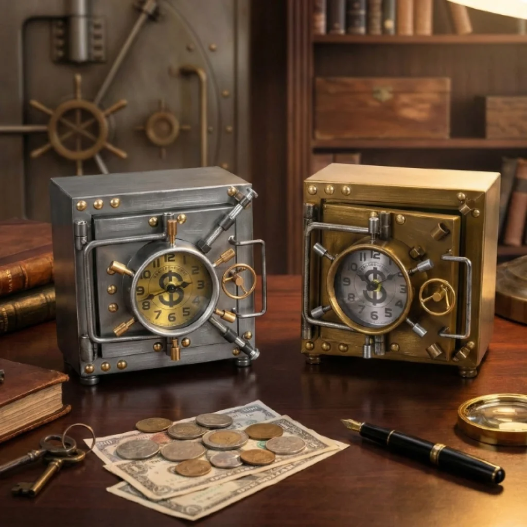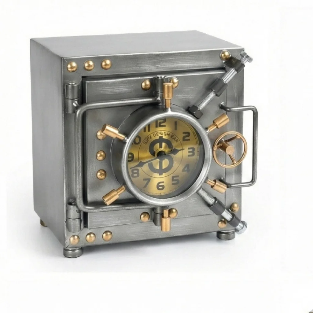 KASA TASARIMLI MASAÜSTÜ SAATÜrün ÖzellikleriKasa tasarımlı masaüstü saat, klasik kasa kapaklarından ilham alan detaylı ve özgün görünümüyle dekoratif saat kategorisinde öne çıkan özel bir modeldir. Metal görünümlü gövdesi, vidalı ve kilitli kasa detayları sayesinde endüstriyel ve retro dekorasyon tarzını başarıyla yansıtır. Saatin ön yüzünde yer alan yuvarlak kadran, net rakam yapısı ile kolay okunabilirlik sunarken mekanik kasa hissi veren tasarımı bulunduğu ortamda dikkat çekici bir dekor unsuru oluşturur. 17x20x21 cm ölçüleri sayesinde masa, raf, kitaplık, ofis masası veya vitrin üzerinde dengeli ve güçlü bir duruş sergiler. Sessiz akan mekanizması sayesinde çalışma, dinlenme ve ofis ortamlarında rahatsızlık oluşturmaz. Dayanıklı yapısı uzun süreli kullanım için uygundur. Renk seçeneği bulunmamaktadır; ürün gümüş veya altın tonlu kasa seçeneklerinden karışık olarak gönderilmektedir. Hem fonksiyonel hem de dekoratif bir masa saati arayanlar için şık ve farklı bir alternatiftir.Paket İçeriği1 adet kasa tasarımlı masaüstü saat