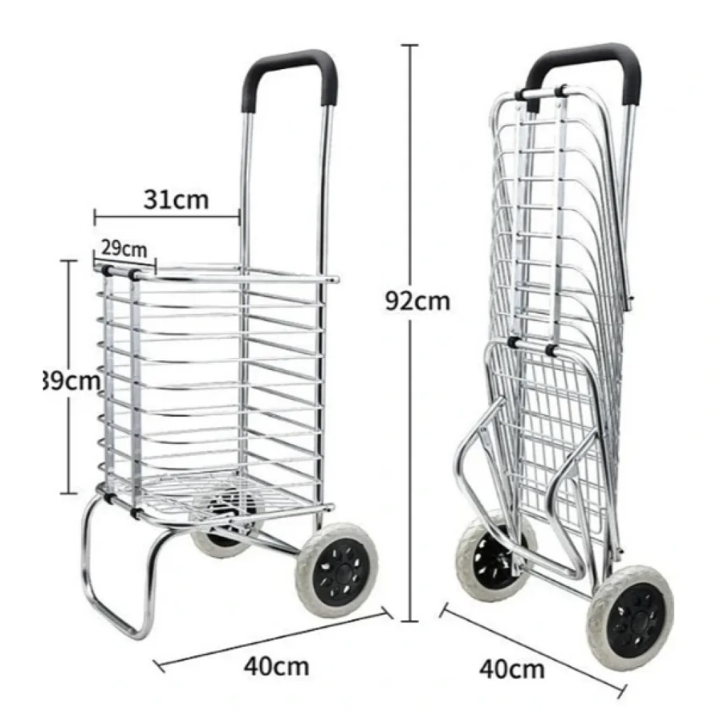 KATLANABİLİR TAŞINABİLİR ALIŞVERİŞ VE TAŞIMA ARABASIÜrün ÖzellikleriBu taşıma arabası, dayanıklı alüminyum çerçeveye sahiptir ve maksimum 20-30 kg yük taşıma kapasitesi sunar. Açık hali 92 cm yüksekliğe ve 40 cm genişliğe sahip olan ürün, kapalı halde kompakt bir şekilde muhafaza edilebilir. Sepeti 39 cm derinliğinde, 31 cm genişliğinde ve 29 cm boyutundadır.Bu taşıma arabası, market, pazar veya AVM alışverişlerinde kolaylık sağlar. Ayrıca ağır yüklerin taşınması, depo ve ofislerde küçük boyutlu kutu ya da eşyaların taşınması için uygundur. Seyahatlerde bagaj taşıma için de ideal bir çözümdür.Tekerlekleri, geniş ve dayanıklı lastik yapıya sahiptir, bu da zorlu yüzeylerde kolay hareket imkanı sunar. Ergonomik ve yumuşak tutma sapı, uzun süreli kullanımda bile rahatlık sağlar.Paket İçeriği1 adet Katlanabilir Taşınabilir Alışveriş ve Taşıma Arabası