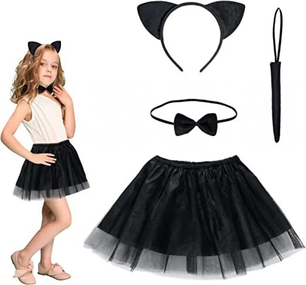 BUĞZ Kedi Eteği Tacı Kuyruğu ve Papyon Seti Siyah Renk Çocuk Boy
