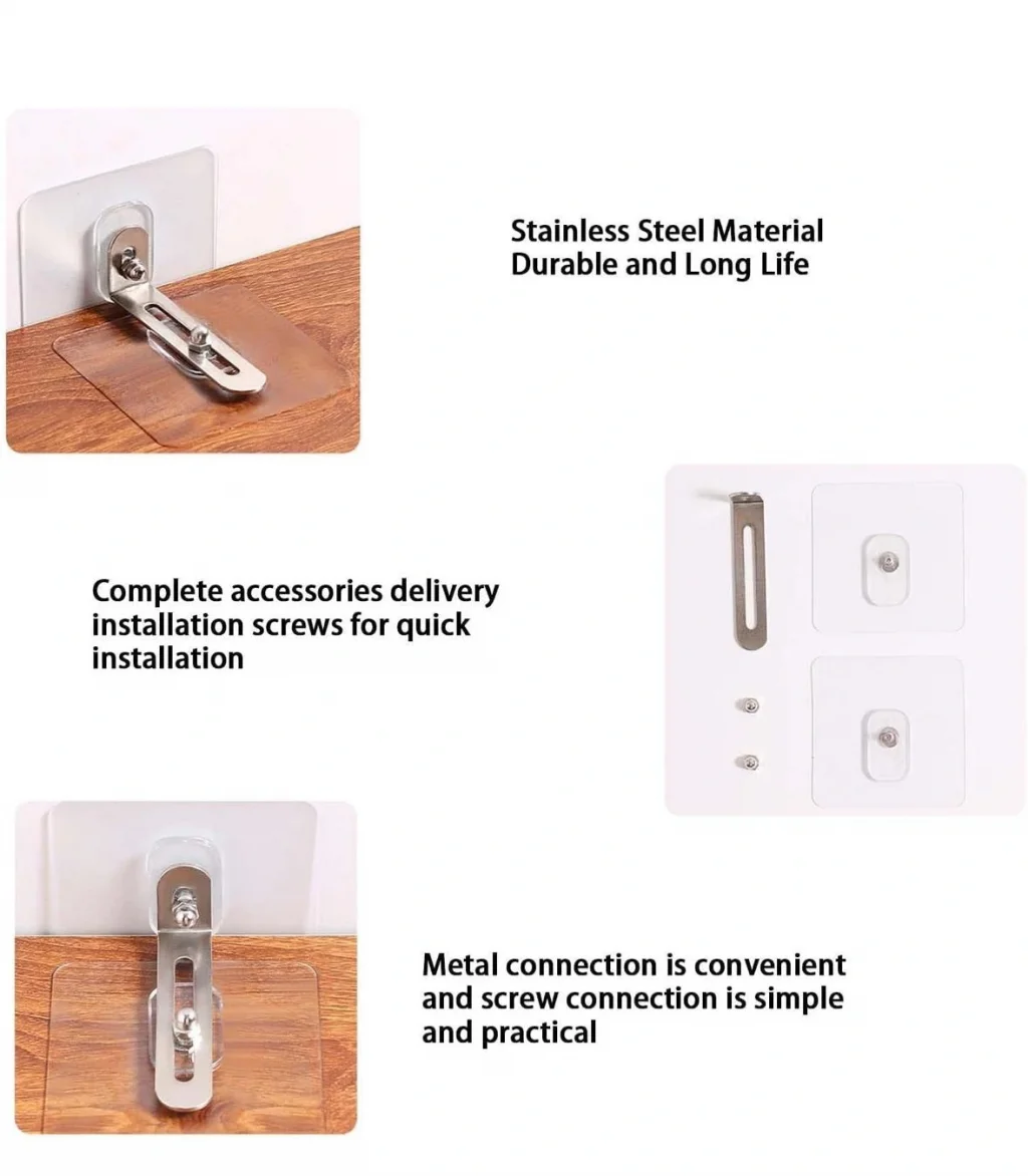 MOBİLYA SABİTLEME APARATIÜrün ÖzellikleriMobilya sabitleme aparatı, devrilme ve düşme riski olan eşyalarınızı güvenli bir şekilde sabitlemek için tasarlanmıştır. Nem ve su geçirmez özelliğe sahip bu aparat, yüksek viskoziteli yapışkanları sayesinde zemine güçlü bir şekilde tutunur ve dayanıklılık sağlar. Kolay kurulumu ile pratik bir kullanım sunar. Yapıştırılacak alanı bir bezle temizledikten sonra, yapışkan yüzeyleri ayırarak duvara ve sabitlenecek eşyaya kolayca monte edebilirsiniz. Sabitleyici kilit mekanizması, eşyalarınızın güvenliğini artırır.Deprem ve çocuk koruması sağlayan bu aparat, yüksek kaliteli metal tokalar ve güçlü yapışkan bantlardan oluşur. Kurulumdan sonra sağlam bir sabitleme sağlar ve uzun yıllar boyunca kullanılabilir. Gardırop, kitaplık, TV dolabı, şifonyer gibi mobilyalar için geniş bir kullanım alanına sahiptir.Paket İçeriği1 adet sabitleme aparatı seti (2 adet vidalı yapışkan + 1 adet metal parça)