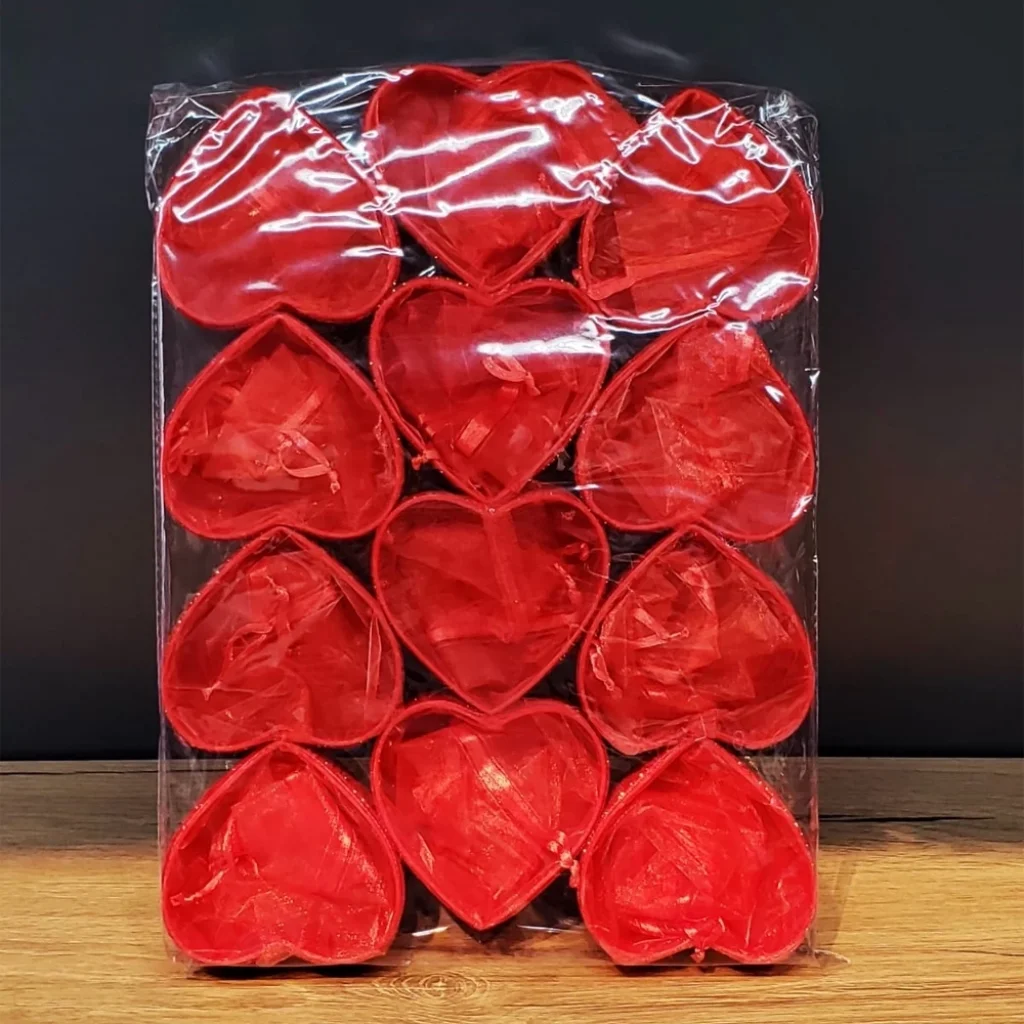 Toptan kalp desenli kırmızı tül kese kına gecelerinde içine çerez koyabileceğiniz tül keselerden.