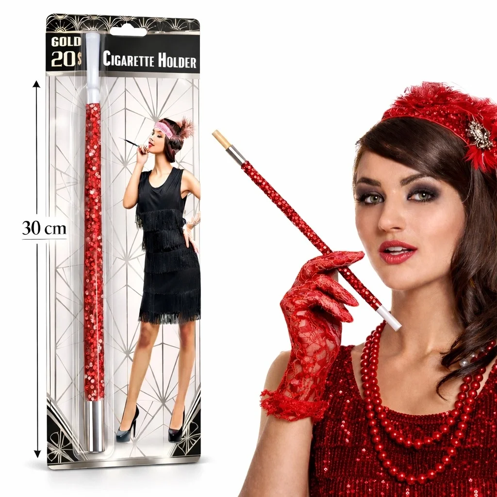 KIRMIZI PAYETLİ SİGARA TUTACAĞIÜrün ÖzellikleriKırmızı Payetli Sigara Tutacağı, 1920’ler temalı parti ve özel organizasyonlar için tasarlanmış gösterişli bir kostüm aksesuarıdır. 30 cm uzunluğundaki ideal ölçüsü sayesinde elde zarif bir duruş sağlar ve kombinlere nostaljik bir hava katar. Kırmızı renkli payet kaplama tasarımı ışık altında dikkat çekici bir parlaklık sunan kırmızı sigara tutacağı, özellikle Gatsby konseptli davetlerde öne çıkan bir detaydır. Uzun ve ince formu ile fotoğraf çekimlerinde estetik bir siluet oluşturan 1920ler parti aksesuarı, kostüm partileri, yılbaşı etkinlikleri ve temalı geceler için tamamlayıcı bir üründür. Gösterişli tasarımı ile dikkat çeken payetli sigara tutacağı, vintage stil kombinlerini tamamlayan şık bir aksesuardır.Ürün Teknik Özellikleri Özellik Açıklama Ürün Adı Kırmızı Payetli Sigara Tutacağı Uzunluk 30 cm Renk Kırmızı Tasarım Payet Kaplama Kullanım Alanı 1920'ler Temalı Partiler ve Kostüm Organizasyonları Paket İçeriği1 Adet Kırmızı Payetli Sigara Tutacağı