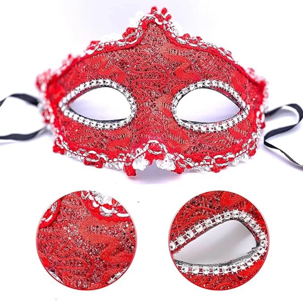 Özel günlerinize zarafet ve gizem katacak bu şık maskeyle göz alıcı bir görünüm elde edin Kırmızı renk, maske tasarımına dikkat çekici bir parlaklık ve cazibe katarken, zarif dantel detayları maskenize feminen bir hava kazandırır. Göz kısmındaki özgün tasarım, hem gizemli hem de etkileyici bir hava yaratır.