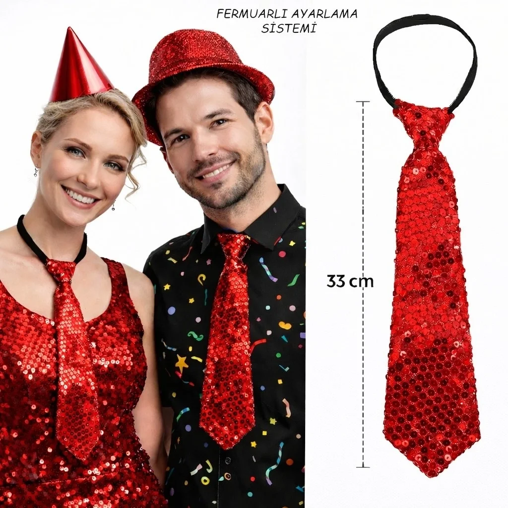 KIRMIZI RENK PUL PAYETLİ IŞILTILI PARTİ KRAVATI 33 CMÜrün ÖzellikleriKırmızı Renk Pul Payetli Işıltılı Parti Kravatı 33 cm, enerjik ve dikkat çekici tasarımıyla eğlenceli organizasyonların vazgeçilmez aksesuarlarından biridir. 33 cm uzunluğundaki önceden şekillendirilmiş yapısı sayesinde her zaman düzgün ve hazır bir görünüm sunar. Yoğun pul payet kaplaması ışığı güçlü şekilde yansıtarak sahne ve parti ortamlarında göz alıcı bir etki oluşturur. Arka kısmında bulunan fermuarlı ayarlama sistemi, kravatın boyun ölçüsüne göre kolayca ayarlanmasını sağlar. Lastikli yapısı sayesinde bağlama gerektirmez; saniyeler içinde takılır ve pratik kullanım avantajı sunar. Bu kırmızı payetli parti kravatı, doğum günü organizasyonları, sahne performansları, disko geceleri ve temalı partiler için özel olarak tasarlanmıştır. Gösterişli yapısıyla öne çıkan ışıltılı sahne kravatı, hem kadın hem erkek kullanıcılar için uygundur ve kombinlerinizi tamamlayan dikkat çekici bir pul payetli kostüm aksesuarı olarak tercih edilir.Ürün Teknik ÖzellikleriÖzellikAçıklamaÜrün AdıKırmızı Renk Pul Payetli Işıltılı Parti Kravatı 33 cmUzunluk33 cmRenkKırmızıKaplamaYoğun Pul PayetAyarlama SistemiFermuarlı ve LastikliKullanım ŞekliBağlama Gerektirmez – Hazır FormKullanım AlanıDoğum Günü, Sahne Performansı, Disko, Temalı PartiPaket İçeriği1 Adet Kırmızı Renk Pul Payetli Işıltılı Parti Kravatı 33 cm
