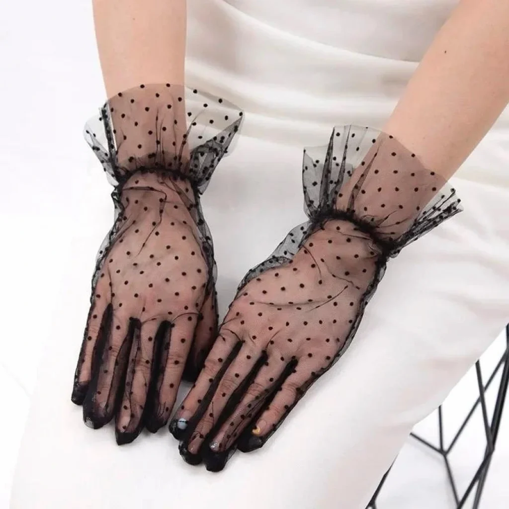 BUĞZ Kısa Güpürlü Siyah Puantiyeli Tül Eldiven