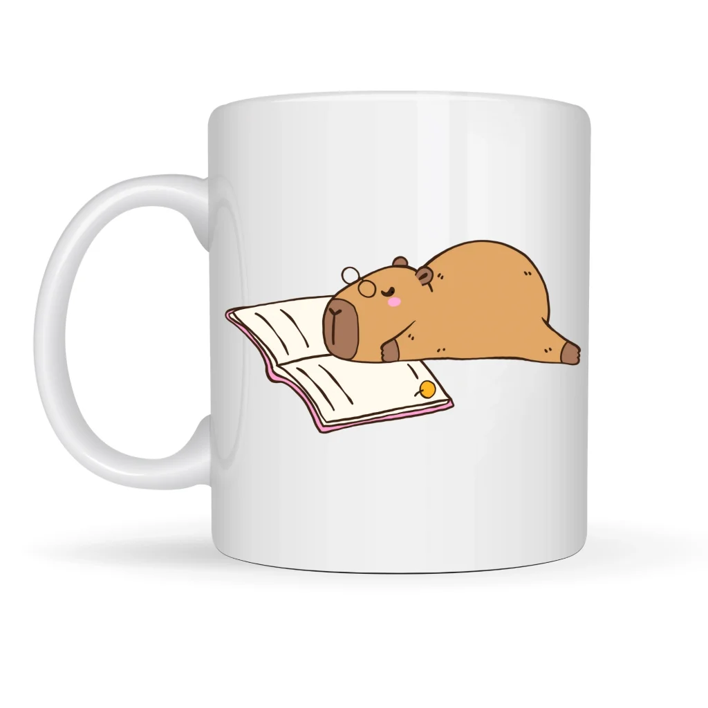 Bu özel tasarım porselen kupa, kitap okurken uyuyakalmış tatlı bir kapibara figürüyle gününüze huzur ve tebessüm katmak için tasarlandı.