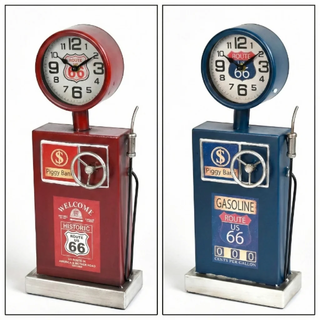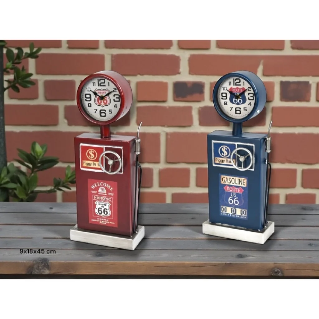KLASİK BENZİNLİK TASARIMLI MASAÜSTÜ SAATÜrün ÖzellikleriKlasik benzinlik tasarımlı masaüstü saat, nostaljik benzin istasyonlarından ilham alan özgün gövde yapısı ve Route 66 temalı detaylarıyla dekorasyona karakter kazandıran özel bir modeldir. Dikey formu ve üst bölümde konumlandırılmış yuvarlak saat kadranı, klasik masa saatlerinden ayrışarak güçlü bir görsel etki oluşturur. Gövde üzerinde yer alan benzin pompası hortumu, vana ve retro grafik baskılar ürüne gerçekçi ve koleksiyonluk bir görünüm kazandırır. Net ve büyük rakamlara sahip analog kadranı sayesinde saat kolayca okunabilir ve hem dekoratif hem işlevsel bir kullanım sunar. 9x18x45 cm ölçüleriyle masa, raf, konsol, kitaplık veya vitrin üzerinde dikkat çekici bir duruş sergiler. Sessiz çalışan mekanizması sayesinde ofis, çalışma odası veya yaşam alanlarında rahatsız edici bir ses oluşturmaz. Dayanıklı malzemeden üretilmiş yapısı uzun ömürlü kullanım sağlar. Renk seçimi yapılamamaktadır; ürün kırmızı veya mavi renk seçeneklerinden biri olacak şekilde karışık gönderilmektedir. Retro, vintage ve endüstriyel dekorasyon tarzlarını tamamlayan bu masaüstü saat, dekoratif obje arayanlar için ideal bir tercihtir.Paket İçeriği1 adet klasik benzinlik tasarımlı masaüstü saat