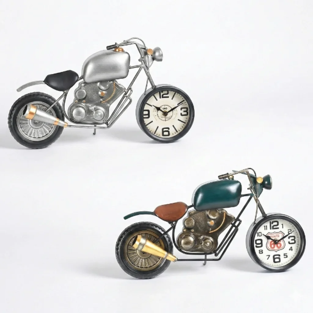 KLASİK MOTOR TASARIMLI MASAÜSTÜ SAATÜrün ÖzellikleriKlasik motor tasarımlı masaüstü saat, retro motosiklet estetiğini dekoratif bir saat formuyla buluşturan özgün ve dikkat çekici bir tasarıma sahiptir. Gövdesi klasik chopper tarzı motor detaylarıyla şekillendirilmiş olup, metal görünümlü motor bloğu, egzoz, sele ve jant detayları sayesinde gerçekçi bir obje hissi sunar. Ön tekerlek kısmına entegre edilmiş analog saat kadranı, büyük ve net rakamları sayesinde kolay okunabilirlik sağlar ve dekoratif yapısını işlevsellikle tamamlar. 45x25 cm ölçüleriyle masa, raf, konsol veya vitrin üzerinde güçlü bir duruş sergileyerek ortamın odak noktası haline gelir. Sessiz çalışan mekanizması sayesinde ofis, çalışma odası veya yaşam alanlarında rahatsız edici bir ses oluşturmaz. Retro, endüstriyel ve vintage dekorasyon stilleriyle uyumlu yapısı sayesinde kafe, ofis ve ev dekorasyonlarında estetik bir tamamlayıcı olarak kullanılabilir. Renk seçimi yapılamamaktadır; ürün, görsellerde yer alan motor modellerinden biri olacak şekilde karışık olarak gönderilmektedir. Koleksiyonluk görünümü ve detaylı işçiliğiyle hediye alternatifi olarak da öne çıkan bir masaüstü saat modelidir.Paket İçeriği1 adet klasik motor tasarımlı masaüstü saat