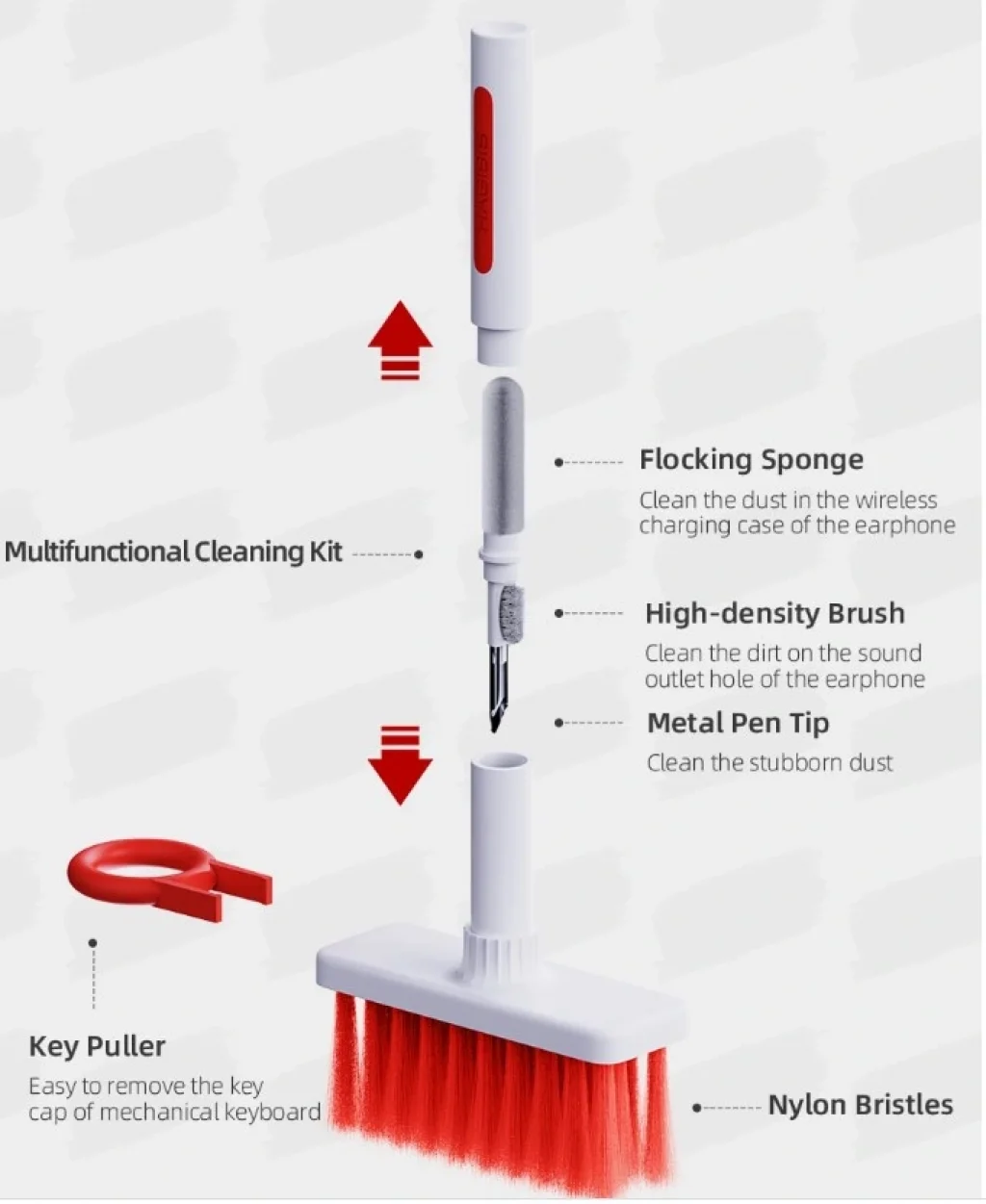 KLAVYE VE KULAKLIK TEMIZLEME SETIÜrün ÖzellikleriNaylon kıllar ile  bilgisayar temizleme kiti, sünger, fırça, Metal kalem ucu ve klavye tuş çektirmesi, çeşitli temizlik ihtiyaçlarını karşılamak için çift kafa gizli tasarımSünger kulaklık kablosuz şarj durumunda toz temizleyebilirsiniz. Fırça, kulaklığın ses çıkış deliğindeki kiri temizleyebilir. Metal kalem ucu inatçı tozu temizleyebilir4 çeşit temizlik kafası, çok amaçlı, klavye ve kulaklıkların her köşesinde derin temizlik yapabilirsiniz.Paket İçeriği1 Adet Klavye ve Kulaklık Temizleme Seti