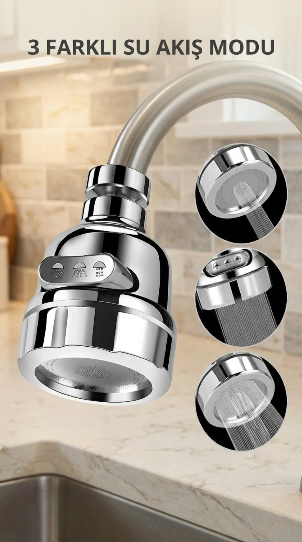 Krom döner musluk başlığı, su tasarrufu sağlarken üç farklı fonksiyon sunar. Mutfak ve banyo lavabolarında kullanılabilir. Döner mekanizması, suyun yönünü kolayca ayarlamanıza imkân tanır.