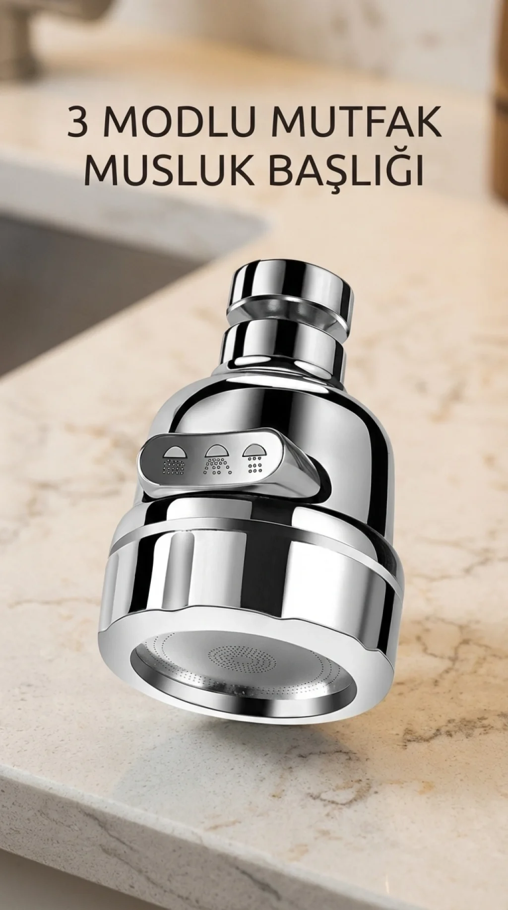 Krom kaplamalı döner musluk ucu, su tasarrufu sağlayarak hem mutfak hem de lavabo kullanımına uygundur. Üç farklı fonksiyonu sayesinde akış hızını ayarlama imkanı sunar. Dayanıklı yapıdadır ve montajı kolaydır.