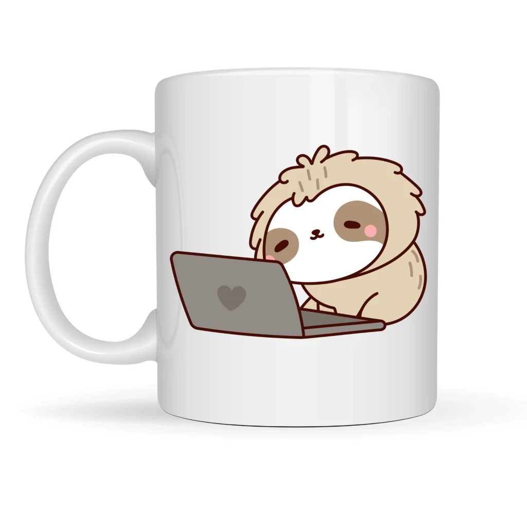 Bu kupa üzerindeki laptoplu tembel hayvan, modern hayatın tatlı bir özeti: