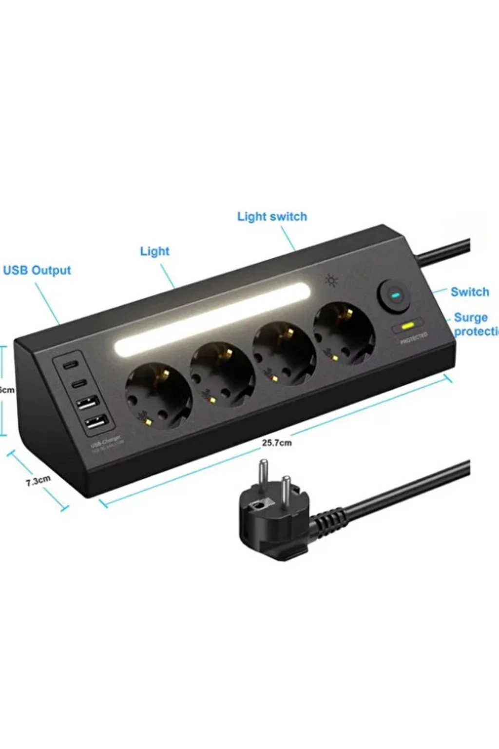 4 Adet AC Priz: Elektronik cihazlarınızı aynı anda çalıştırın. 2x USB + 2x Type-C Çıkışı: Akıllı telefon, tablet, kulaklık gibi cihazlar için hızlı şarj imkânı. 2 Metre Uzunlukta Güç Kablosu: Uzak priz noktalarına kolay erişim. Masa altı, yatak başı veya ofis masalarında konumlandırma kolaylığı. Akım koruma Özelliği Gece Lambası: Ortamı rahatsız etmeyen yumuşak ışık dokunmatik aç/kapa ile kullanım.