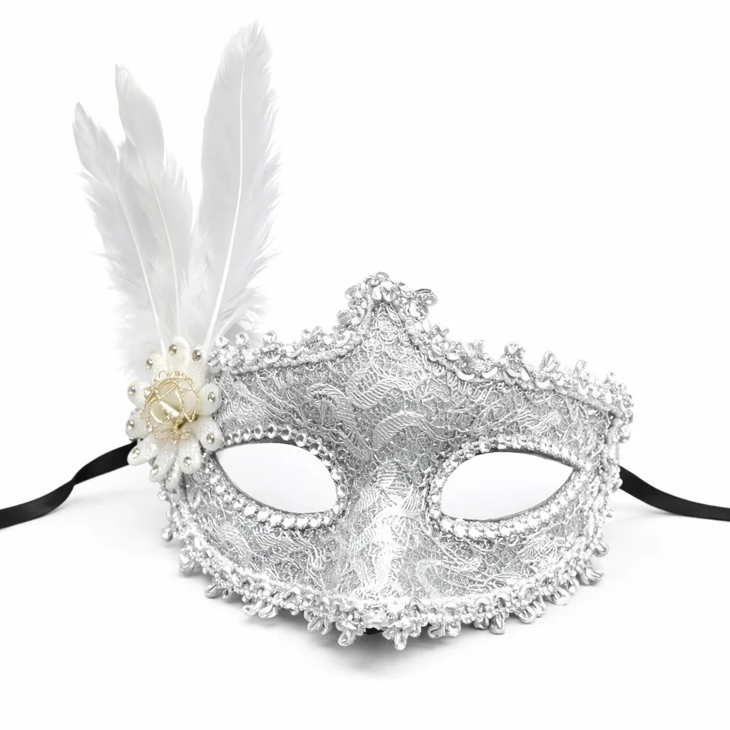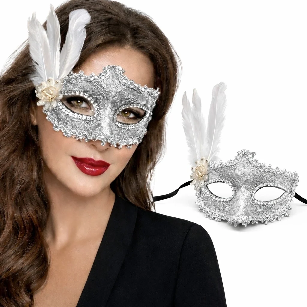 Beyaz, her zaman asil ve sofistike bir renk olarak öne çıkar. Bu maskede, klasik siyahın zarafeti, tüylü detaylarla hareket kazanır. Göz çevresini saran dantel, şıklığına şıklık katarken, taşlarla bezenmiş bölümler, maskenize ışıltı ve parlaklık ekler.