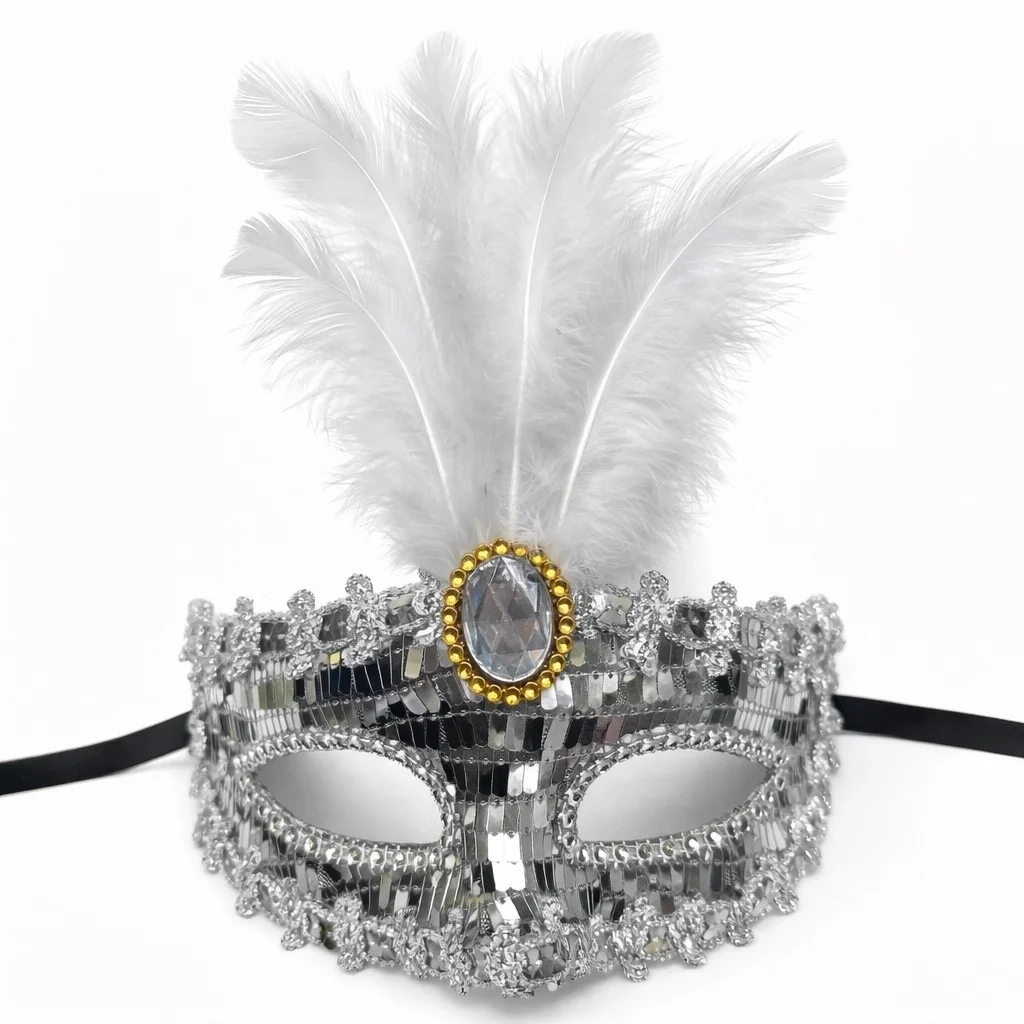 Zarafeti ve ışıltıyı bir arada sunan Gümüş Tüylü Taşlı Balo Maskesi, şık davetler ve konsept organizasyonlar için tasarlanmıştır.