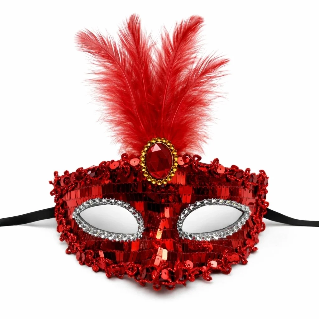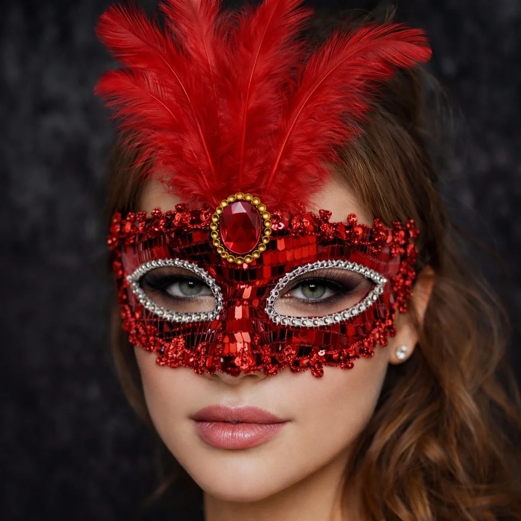 Kırmızı Renk Payetli Pullu Tüylü Parti Maskesi