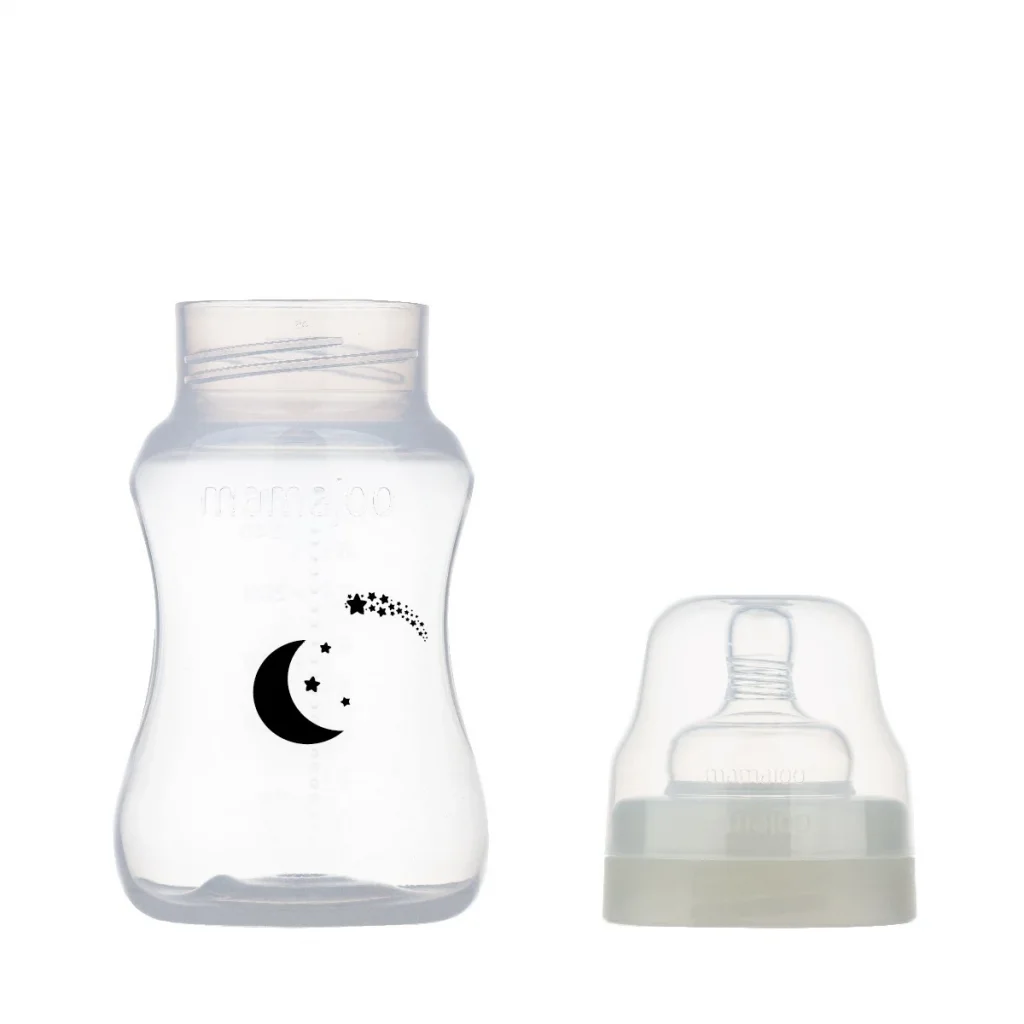 Mamajoo Gece Biberonu hem gündüz hem gece kullanım için uygundur ve karanlıkta parlayan kapatma halkası biberonu gece kolaylıkla bulmanızı sağlar. Mamajoo Gece Biberonu bebeklerin sağlığı için uygun olmayan maddeler içermeyen, Türkiye, Avrupa ve ABD’de biberon üretiminde kullanılmasına izin verilen PP(Polipropilen) ham maddesinden üretilmiştir. Mamajoo Gece Biberon emziğinde bulunan anti-kolik valf sistemi bebeğin beslenme sırasında hava yutması sonucu oluşan gaz sancısını (kolik) engellemeye yardımcı olur. Dengeli duruş için geniş tabanı, minik ellerin kolay tutması için gövde üzerinde tutma kavisleri bulunur. Mamajoo Gece Biberonlarının kapakları biberon emziğinin yerleşimi için özel olarak tasarlanmıştır. Mamajoo Gece Biberonlarının kapakları biberon emziğini tamamen kapattığından kullanım ve taşımada kesin sızdırmazlık sağlar. Biberon üzerinde bulunan ölçek işaretleri de bebeğin ne kadar beslendiğinden emin olunmasını sağlar. Anne göğsüne benzer formda sunulan Mamajoo Gece Biberon Emziği, üzerinde bulunan helezonlar sayesinde anne memesi gibi esner. Geniş ağızlı Mamajoo Gece Biberonun doldurulması ve temizlenmesi kolaydır, geniş tabanı sayesinde kolayca devrilmez. Minik ellerin kolayca tutabilmesi ve kas gelişiminin desteklemesi amacıyla Mamajoo Gece Biberonun gövdesinde ergonomik kavrama kavisleri tasarlanmıştır. Tatsız ve kokusuz Mamajoo Gece Biberon Emziği sayesinde emzirme ile biberonla beslemeyi birleştirmeyi kolaylaştırır. Biberonla birlikte kullanılmak için bebeklerin gelişimine ve ihtiyacına uygun olarak farklı sıvı akış oranlarına sahip 4 çeşit Mamajoo Biberon Emziği bulunur. Uygun Olduğu Avrupa Standardı: EN 14350