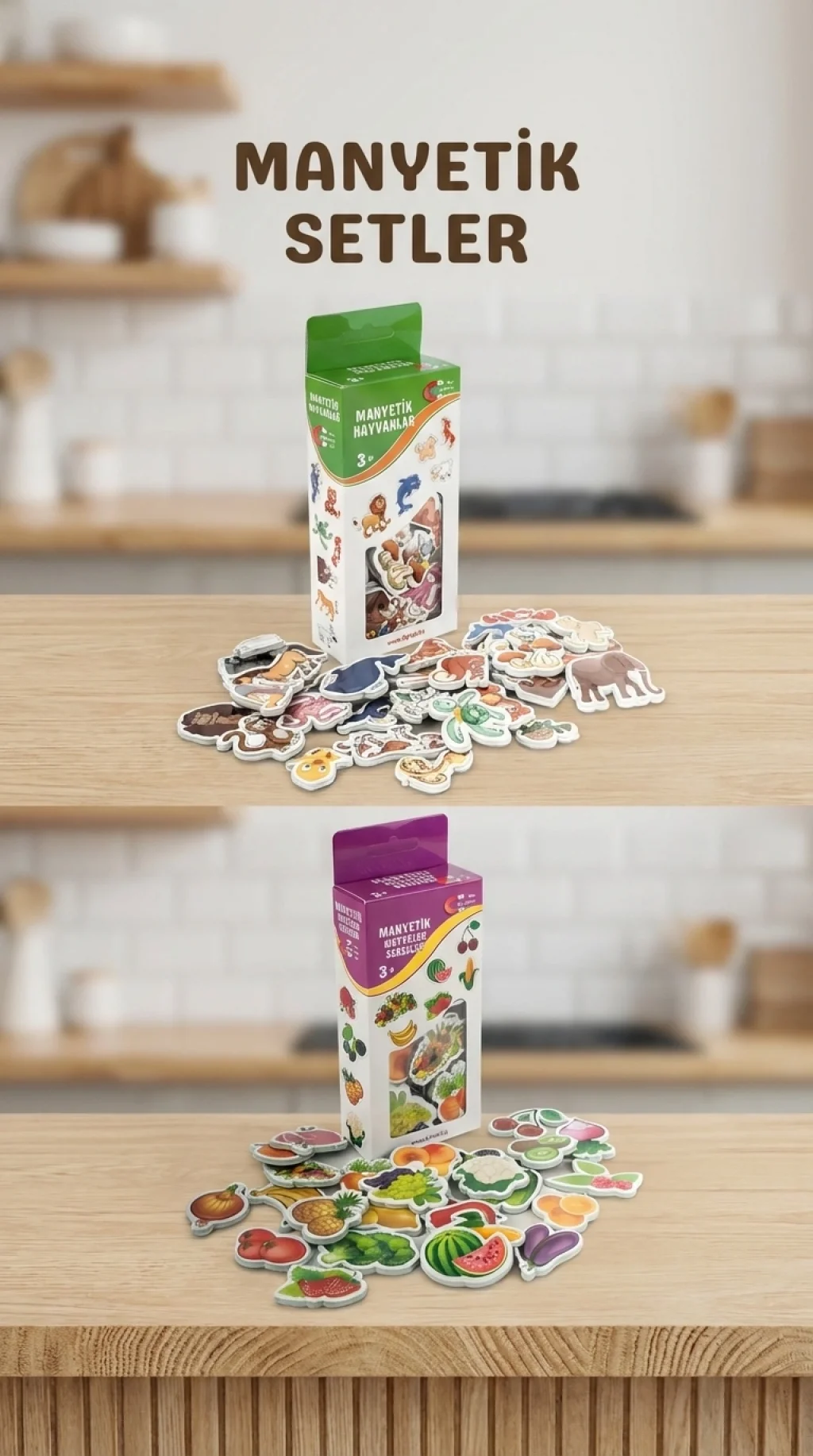 30 parçalı hayvan figürleri ve 26 parçalı sebze meyve seti ile çocukların eğlenceli vakit geçirmesine olanak tanır. Bu set, buzdolabına kolayca yapışabilen manyetik özelliktedir. Hem eğitici hem de yaratıcı oyunlar oluşturmak için idealdir. Farklı parçalarla çeşitli senaryolar oluşturulabilir. Çocukların el ve göz koordinasyonunu geliştirmeye yardımcı olur.