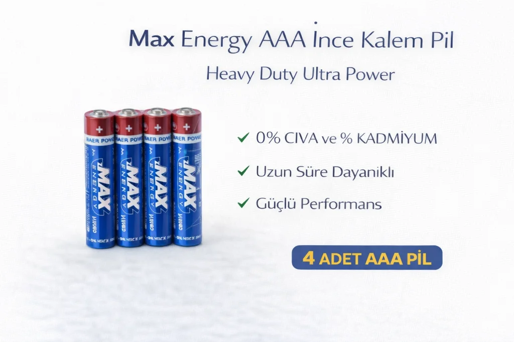 Ürün Açıklaması Max Energy AAA ince kalem pil, 1.5V gücü ile günlük kullanım gerektiren elektronik cihazlar için güvenilir ve uzun ömürlü enerji sağlar. Heavy Duty teknolojisi sayesinde uzaktan kumanda, duvar saati, oyuncak, kablosuz mouse, el feneri ve küçük ev aletlerinde stabil performans sunar. Ürün 2 farklı varyasyon seçeneği ile sunulmaktadır: