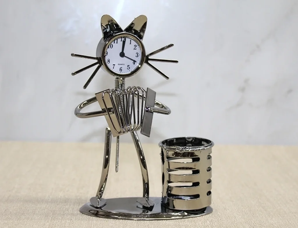 METAL AKORDİYON ÇALAN MÜZİSYEN KEDİ SAAT VE KALEMLİK – 17X12 CMÜrün ÖzellikleriMetal akordiyon çalan müzisyen kedi figürü, dekoratif şıklığıyla çalışma masalarına farklı bir hava katar. El yapımı görünümlü detaylı tasarımı sayesinde hem müzik tutkunlarına hem de kedi severlere hitap eder. Saat fonksiyonu, ürünü sadece dekoratif olmaktan çıkararak pratik bir kullanım sağlar. Yan kısmında yer alan kalemlik bölümü ise masa düzenini korumaya yardımcı olur. 17x12 cm ölçüleriyle kompakt bir boyuta sahip olan bu masa üstü aksesuarı, hediye olarak da ideal bir tercihtir.Paket İçeriği1 adet Metal Akordiyon Çalan Müzisyen Kedi Müzisyen Saat Ve Kalemlik