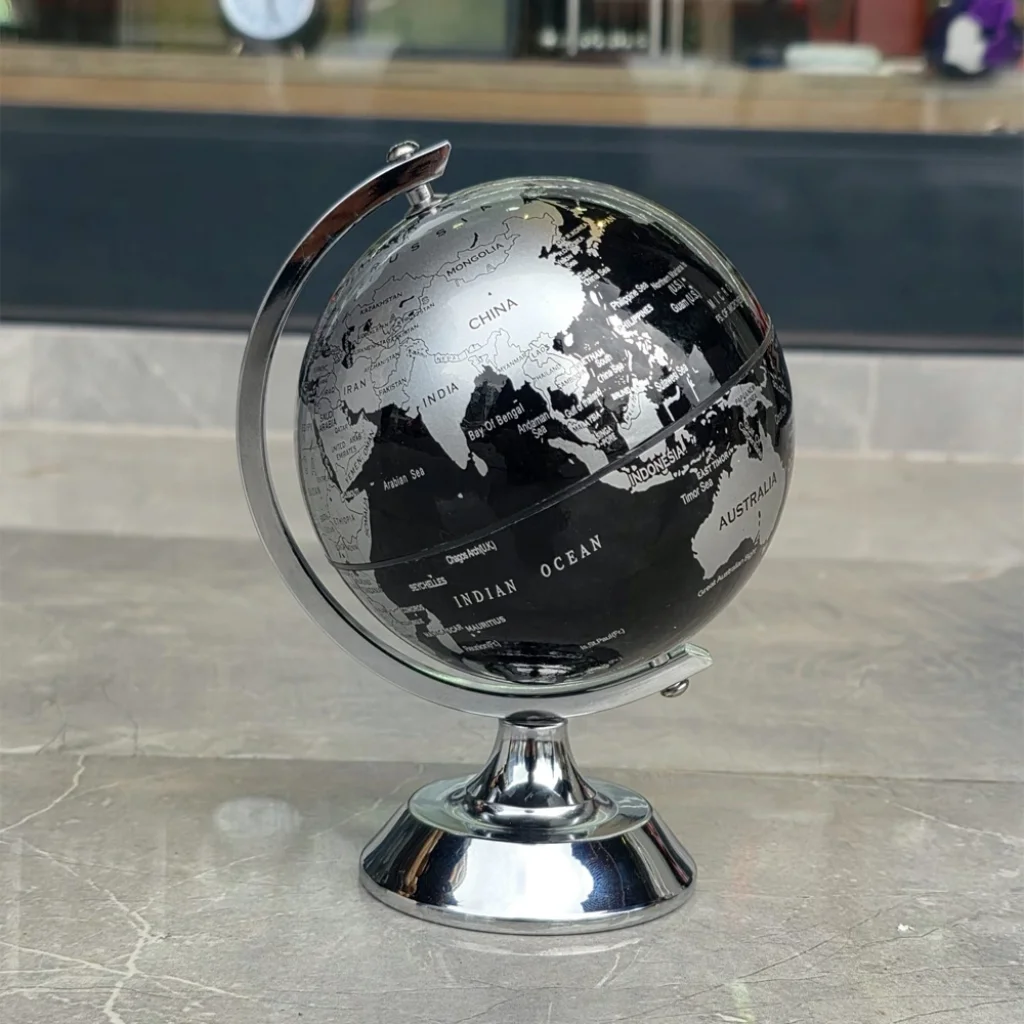 METAL AYAKLI SİYAH DÜNYA KÜRESİ Ürün ÖzellikleriÇalışma alanınıza derinlik ve zarafet katacak bir parça ile tanışın! Metal Ayaklı Siyah Dünya Küresi, klasik harita tasarımını modern bir renk paletiyle harmanlayarak mekanınıza prestij kazandırır. 16 cm yüksekliğindeki bu şık küre, yüksek kaliteli parlak metal ayağı ve birinci sınıf dayanıklı plastik gövdesiyle kaliteyi elinizde hissettirir. Siyah zemin üzerine gümüş tonlarda işlenmiş net ve detaylı harita baskısı, hem keşif ruhunuzu canlı tutar hem de dekorasyonunuzda odak noktası olur. 360 derece dönebilen standlı yapısı sayesinde dilediğiniz noktayı kolayca inceleyebilirsiniz. Minimalist, endüstriyel veya klasik; her türlü iç mekan stiline mükemmel uyum sağlayan bu dünya küresi, ofis masaları, kütüphane rafları ve modern salonlar için ideal bir aksesuardır. Hem iş arkadaşlarınız için etkileyici bir ofis hediyesi hem de kendiniz için şık bir dekoratif çözüm arıyorsanız, bu siyah küre asil duruşuyla en doğru tercih olacaktır.Ürün Teknik ÖzellikleriÖzellikAçıklamaYükseklik16 cmAyak MalzemesiYüksek Kaliteli Parlak Metal (Krom Kaplama)Küre MalzemesiDayanıklı Birinci Sınıf PlastikRenk TemasıSiyah Üzeri Gümüş Detaylı Modern StilTasarımÖzel Detaylı, Standlı ve 360 Derece DönebilirKullanım AlanıOfis Masası, Ev Dekorasyonu, Kütüphane AksesuarıBaskı KalitesiYüksek Çözünürlüklü, Net ve Kaliteli DetaylarPaket İçeriği1 Adet Metal Ayaklı Siyah Dünya Küresi