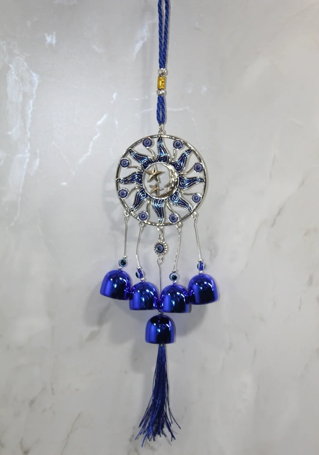 METAL NAZAR BONCUĞU ÇAN MODEL 16Ürün ÖzellikleriMetal Nazar Boncuğu Çan Model 16, geleneksel nazar boncuğu motifleriyle süslenmiş şık ve mistik bir dekor ürünüdür. Rüzgarla birlikte hareket eden metal çanları, huzurlu bir melodi yayarak ortamda sakinleştirici bir etki oluşturur. Nazar boncuğu detayları sayesinde kötü enerjilere karşı koruma sağladığına inanılır. Balkon, kapı, pencere veya iç mekan süslemesi için ideal bir seçimdir. Dekoratif ve anlamlı tasarımıyla her ortama otantik bir hava katmaktadır.Paket İçeriği1 Adet Metal Nazar Boncuğu Çan