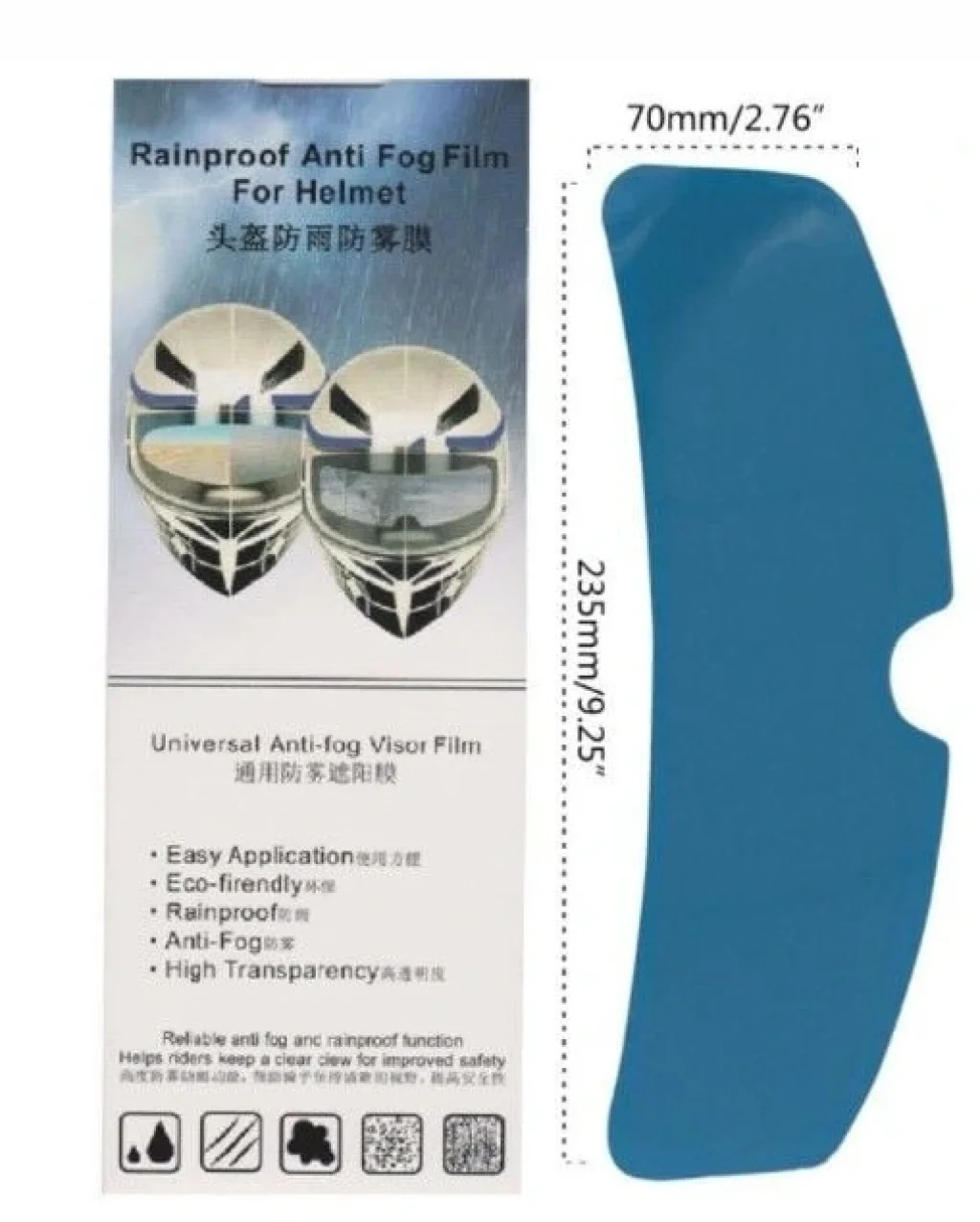 Kurulum adımları: 1. Kask camını.nbsp; temizleyin ve koruyucu tabakayı yırtın. 2. Anti-sis-yağmur filmi kask içine veya dışına yerleştirin (kask içine yerleşim anti-sis, dışına yerleşim anti-yağmur) 3. Lensin ortasından kenara doğru anti-sis filmine hafifçe basın. 4. Kullanıma hazır