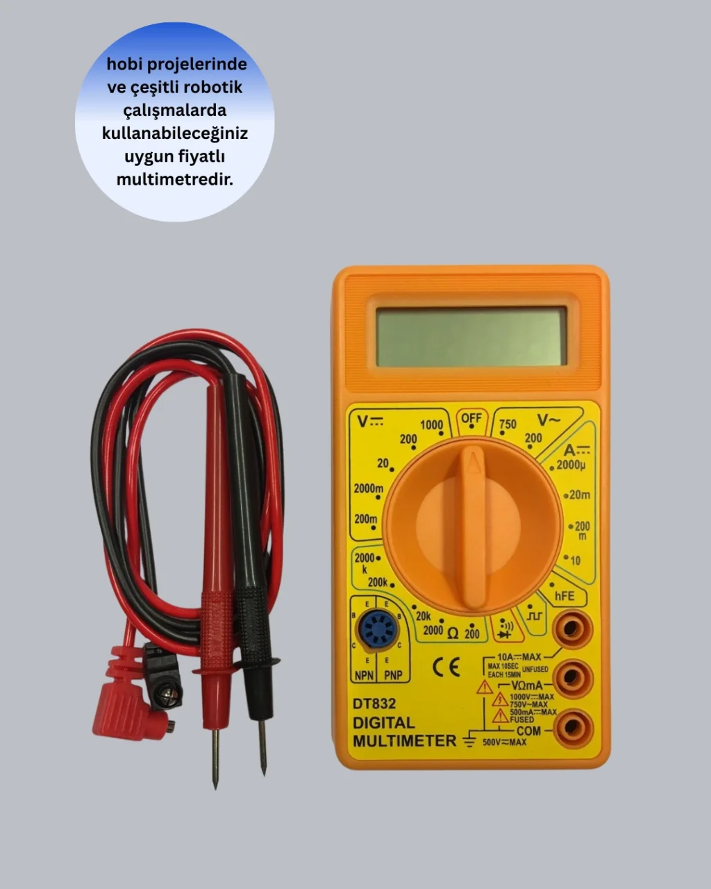AC ve DC ölçüm yapabilen dijital multimetre, elektriksel değerlerin güvenilir şekilde ölçülmesini sağlar. Evde ve profesyonel ortamlarda kullanılabilecek şekilde tasarlanmıştır. Farklı ölçüm ihtiyaçlarını tek bir cihazda toplar.LCD ekranı, ölçüm sonuçlarını okunaklı şekilde sunar. Döner anahtar sistemi, ölçüm modlarının kolayca seçilmesini sağlar. 10 amper destekli ölçüm kapasitesi, standart elektrik uygulamaları için yeterlidir.Gerilim, akım ve direnç ölçümleri sayesinde elektrik devrelerinin durumu kolayca analiz edilebilir. Kablo, priz ve elektronik bileşen kontrollerinde pratik kullanım sunar. Dayanıklı yapısı, cihazın uzun süreli kullanımda performansını korumasına yardımcı olur.Dijital multimetre ölçü aleti, teknik işlerle uğraşanlar ve evde elektrik kontrolü yapmak isteyen kullanıcılar için güvenilir bir yardımcıdır.Ürün Markası: BUĞZ