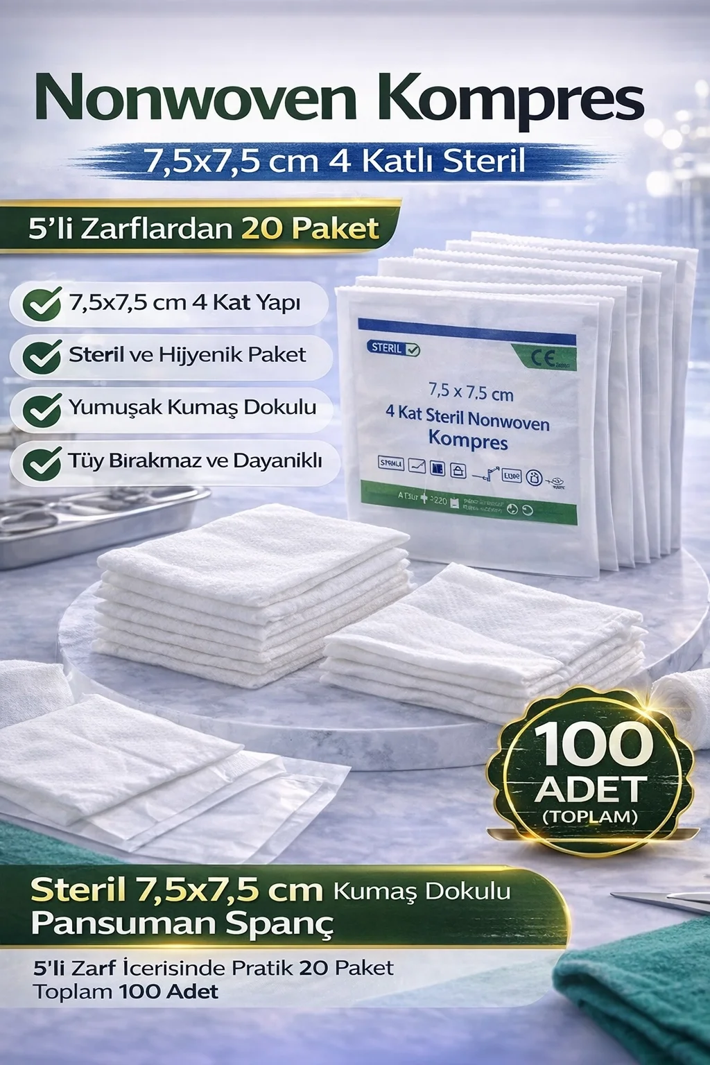 Ürün Açıklaması (SEO Uyumlu): Nonwoven kompres, yumuşak kumaş dokulu ve tüy bırakmayan yapısı sayesinde medikal pansuman ve temizlik uygulamalarında güvenle kullanılabilen steril spanç ürünüdür. 7,5x7,5 cm ölçüsü ve 4 katlı yapısı sayesinde yeterli emicilik sağlar ve hassas bölgelerde konforlu kullanım sunar. Ürün, 5’li steril zarflar halinde paketlenmiş toplam 20 paket (100 adet) içeriğe sahiptir. Bu sayede hijyenik, pratik ve tek kullanımlık medikal uygulamalar için ideal kullanım sağlar. Steril yapısı sayesinde yara temizliği, pansuman kapatma, enjeksiyon öncesi cilt hazırlığı ve medikal bakım uygulamalarında güvenle kullanılabilir. Dayanıklı nonwoven dokusu kolay dağılmaz ve hassas ciltler için uygundur. Hastaneler, klinikler, diş hekimleri, sağlık kabinleri ve evde bakım uygulamalarında profesyonel kullanım için ideal bir üründür.