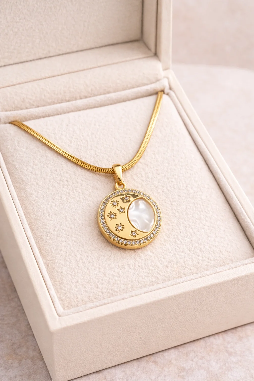 Paslanmaz Çelik Ay Yıldız Kolye MODEL 7 – Gold Kaplama Zirkon Taşlı Zarif Tasarım | Kararmaz Kadın Kolyesi Gökyüzünden ilham alan şık ve anlamlı tasarımıyla öne çıkan paslanmaz çelik ay yıldız kolye, zarif detaylarıyla günlük kullanıma uygun özel bir aksesuardır. Yuvarlak formdaki kolye ucu üzerinde yer alan ay ve yıldız figürleri, sedef görünümlü yüzey ve çevresini saran ışıltılı zirkon taşlar ile estetik bir görünüm sunar. Paslanmaz çelik materyal sayesinde kararma, solma ve renk atması yapmaz. Gold kaplama yüzeyi uzun süre parlaklığını korur. Küçük ve hafif kolye ucu sayesinde boyunda sade, zarif ve modern bir duruş sağlar. Günlük kombinlerden özel günlere kadar her stile kolayca uyum sağlar. Tek başına kullanıldığında minimal, katmanlı kombinlerde ise trend bir görünüm oluşturur. ? Öne Çıkan Özellikler