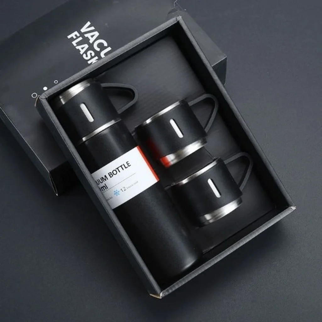 PASLANMAZ ÇELİK BARDAKLI TERMOS SETİ 500 ML.Ürün ÖzellikleriTutma kulp sayesinde kolayca taşınır.3 adet bardağı mevcuttur.2 katmanlı hassas teknoloji, ısı ve soğuk yalıtımlıdır. Kaydırmaz taban özelliği ile her zemine güçlü tutuş sağlar.12 saat sıcak ve soğuk tutma özelliğine sahiptir.500 ML kapasitesi mevcuttur.304 paslanmaz çelik kalitesi. Ürünün Ebatları:24 cm x 6,6 cm (bardak kulpu dahildir.) Paket İçeriği1 adet paslanmaz çelik bardaklı termos seti 500 ml.