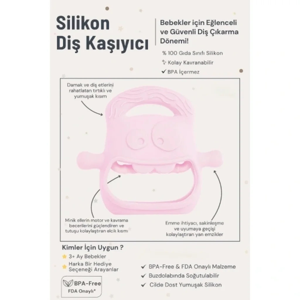PEMBE BEBEK SİLİKON DİŞ KAŞIYICIÜrün ÖzellikleriPembe silikon bebek diş kaşıyıcı, bebeklerin diş çıkarma dönemini güvenli, rahatlatıcı ve keyifli hale getirir. Sevimli tasarımı ve farklı dokulara sahip yüzeyleri sayesinde hassas diş etlerine nazikçe masaj yak yatıştırır. Çok yönlü tutma alanları ile minik eller için kolay kavranabilir bir deneyim sunar.Çift yönlü emzik kolları, bebeklerin doğal emme refleksini desteklerken parmak emmenin önüne geçmeye yardımcı olur. Aynı zamanda çene kaslarını çalıştırarak ağız ve çene gelişimine katkıda bulunur. Hafif, esnek ve ergonomik yapısı sayesinde bebekler kolayca kavrayabilir.Sadece rahatlatıcı bir ürün olmakla kalmaz, aynı zamanda motor ve duyusal gelişimi destekleyen bir oyun arkadaşıdır. Farklı dokular bebeğin dokunsal keşfini teşvik ederken, kavrama becerisini güçlendirir. %100 gıda sınıfı silikon malzeme ile üretilmiştir, BPA, BPS ve zararlı kimyasallar içermez. Yeni doğan döneminden itibaren güvenle kullanılabilir.Paket İçeriği1 adet Pembe Bebek Silikon Diş Kaşıyıcı