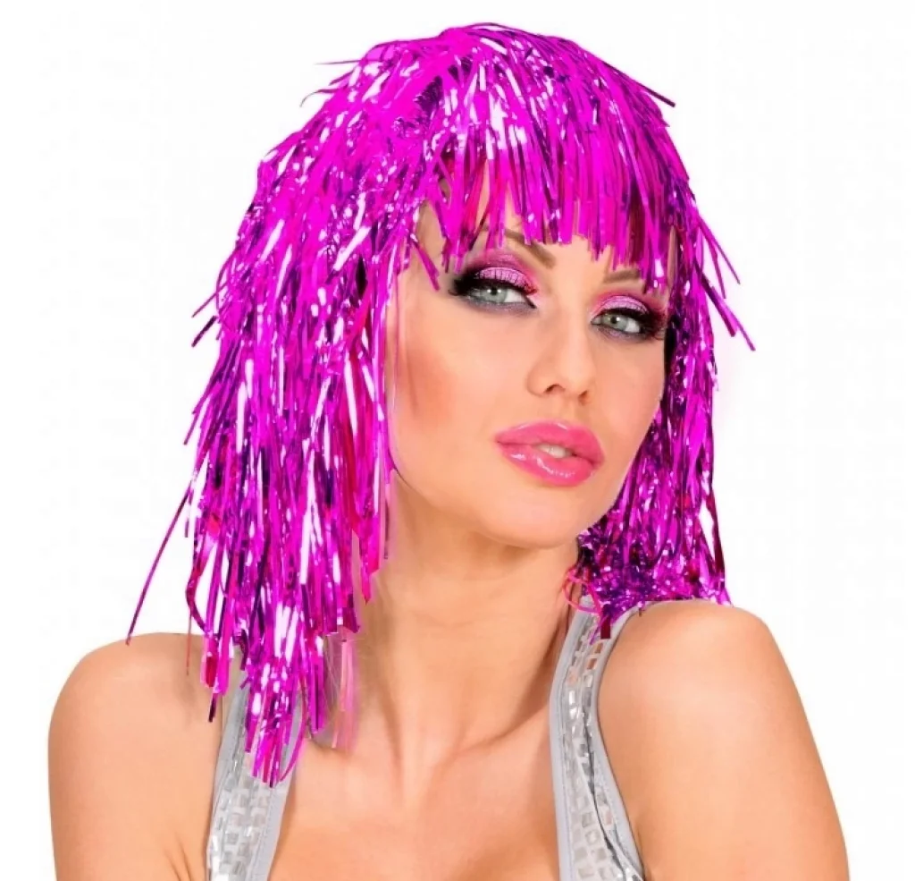 Feminen ve enerjik görünümün anahtarı metalize fuşya peruk ile ışıltınızı ortaya çıkarın Parlak folyo yapısı, ışık altında dikkat çekici bir görünüm sunar. Eğlenceli davetler ve özel günler için mükemmel bir tamamlayıcıdır.