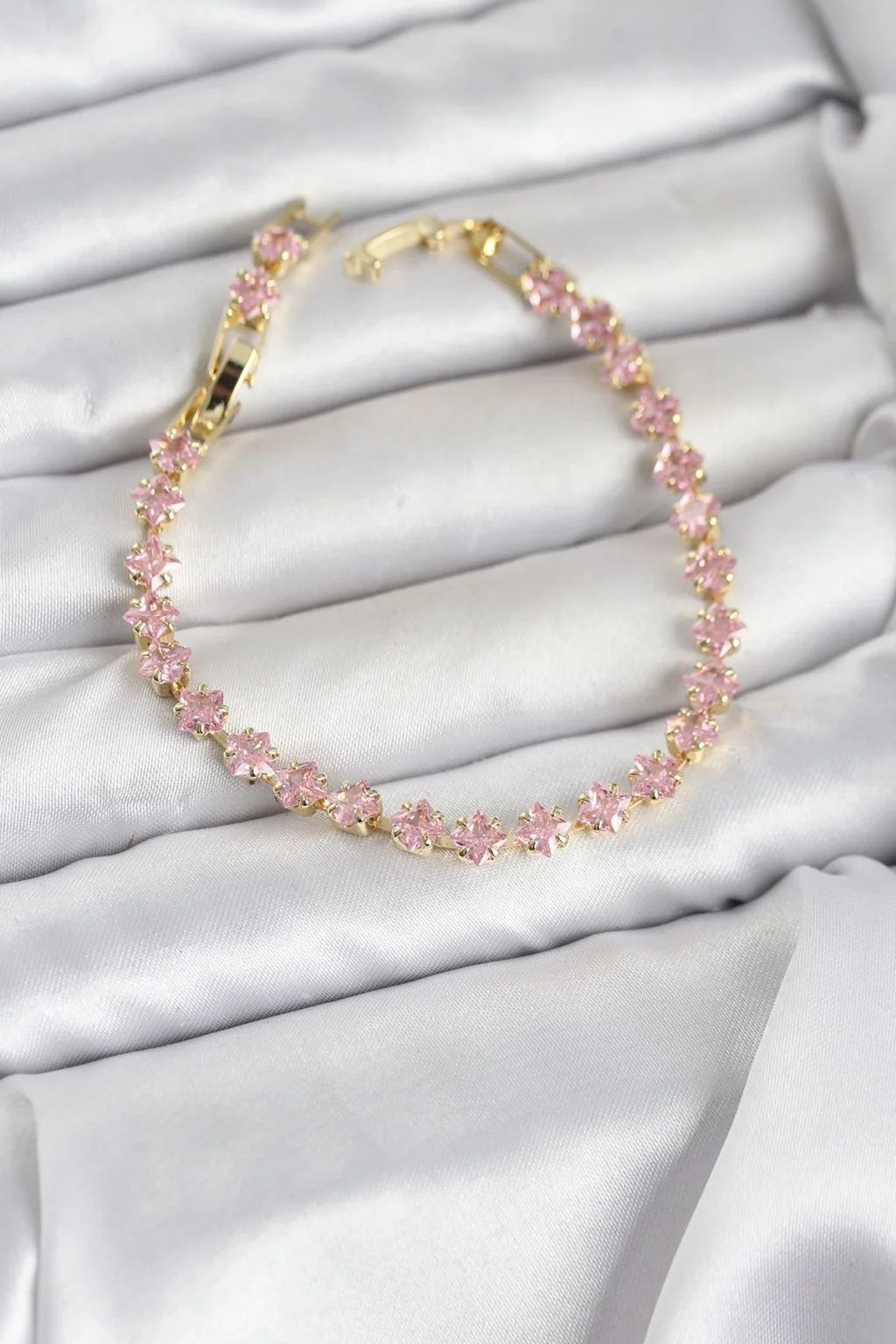 BUĞZ Pembe Kare Zirkon Taşlı Gold Renk Pirinç Su Yolu Kadın Bileklik