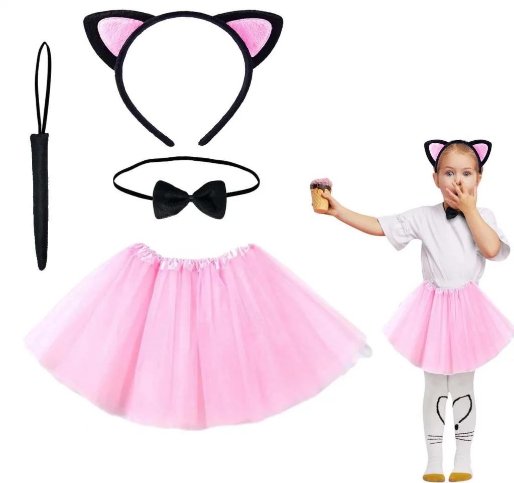 BUĞZ Pembe Renk Etekli Kedi Kostüm Seti (Tütü, Taç, Papyon, Kuyruk)