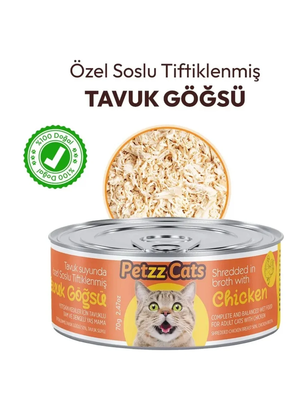 Petzzcats Tavuk Etli Konserve Kedi Maması 1 Adet 70 gr Petzz Cats Tavuk Göğsü Soslu Tiftiklenmiş Yetişkin Kedi Konservesi 70 g, yetişkin kedilerin günlük besin ihtiyaçlarını karşılamak üzere hazırlanmış tam ve dengeli yaş mamadır. Özel sos içinde tiftiklenmiş tavuk göğsü parçaları sayesinde yüksek lezzet sunar ve seçici kediler tarafından kolayca tüketilir. Yüksek kaliteli protein içeriği kas yapısını desteklerken, kolay sindirilebilir yapısı hassas mideye sahip kediler için uygundur. Yüksek nem oranı, kedinizin günlük sıvı alımına katkı sağlar. Günlük ana öğün olarak veya kuru mamaya lezzet artırıcı ek olarak güvenle kullanılabilir. Öne Çıkan Özellikler: