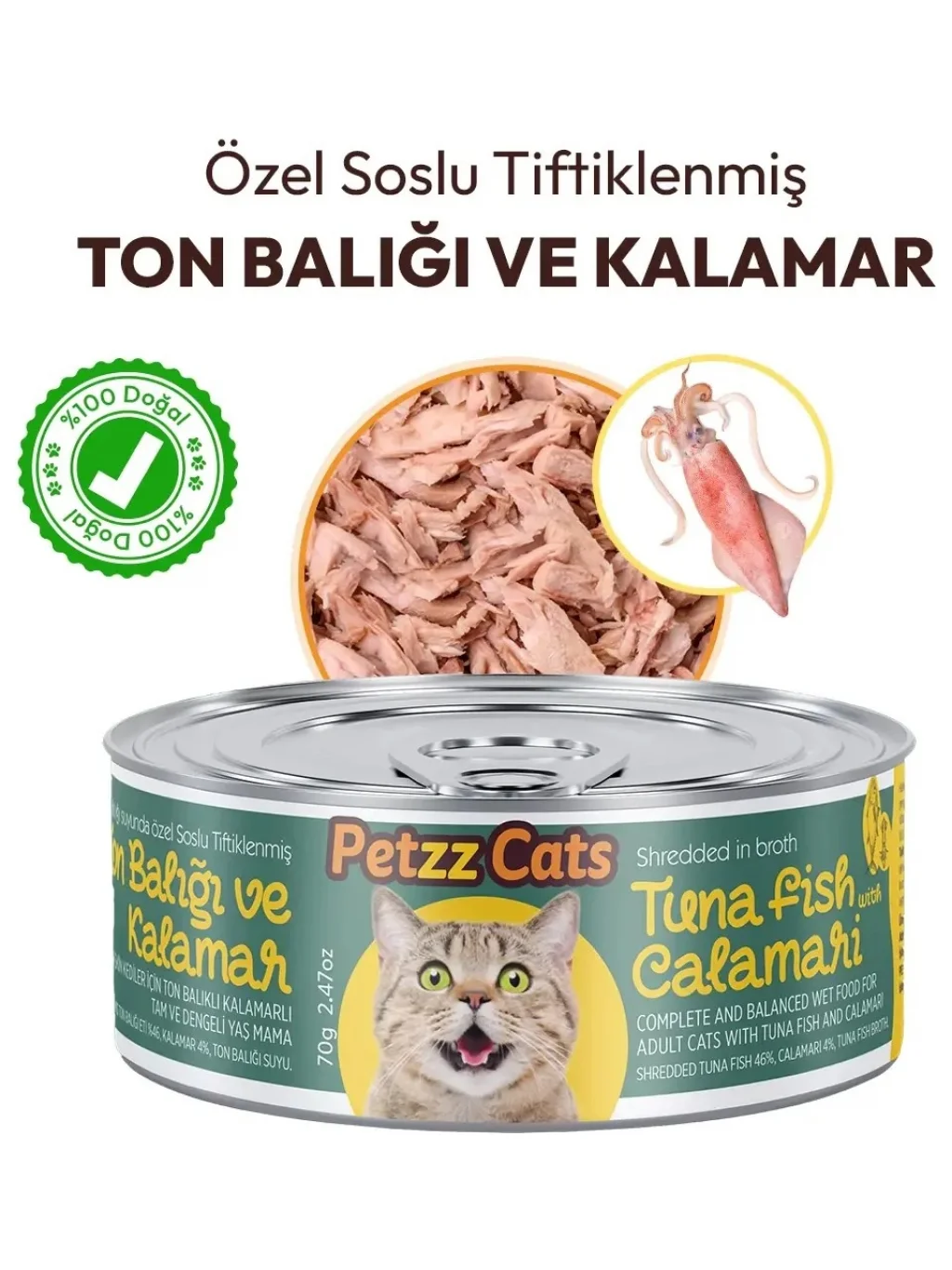 Petzzcats Ton Balığı & Kalamar Konserve Kedi Maması 1 Adet 70 gr Petzz Cats Ton Balığı ve Kalamar Soslu Tiftiklenmiş Yetişkin Kedi Konservesi 70 g, yetişkin kedilerin günlük besin ihtiyaçlarını karşılamak üzere hazırlanmış tam ve dengeli yaş mamadır. Özenle tiftiklenmiş ton balığı parçaları, lezzetli kalamar ve özel sosuyla birleşerek seçici kediler için bile yüksek iştah açıcı bir öğün sunar. Deniz ürünlerinden gelen yüksek kaliteli protein kas yapısını desteklerken, kolay sindirilebilir formül hassas mideye sahip kediler için uygundur. Yüksek nem oranı, kedinizin günlük sıvı alımına katkı sağlar. Günlük ana öğün olarak ya da kuru mamaya lezzet artırıcı tamamlayıcı şeklinde güvenle kullanılabilir. Öne Çıkan Özellikler: