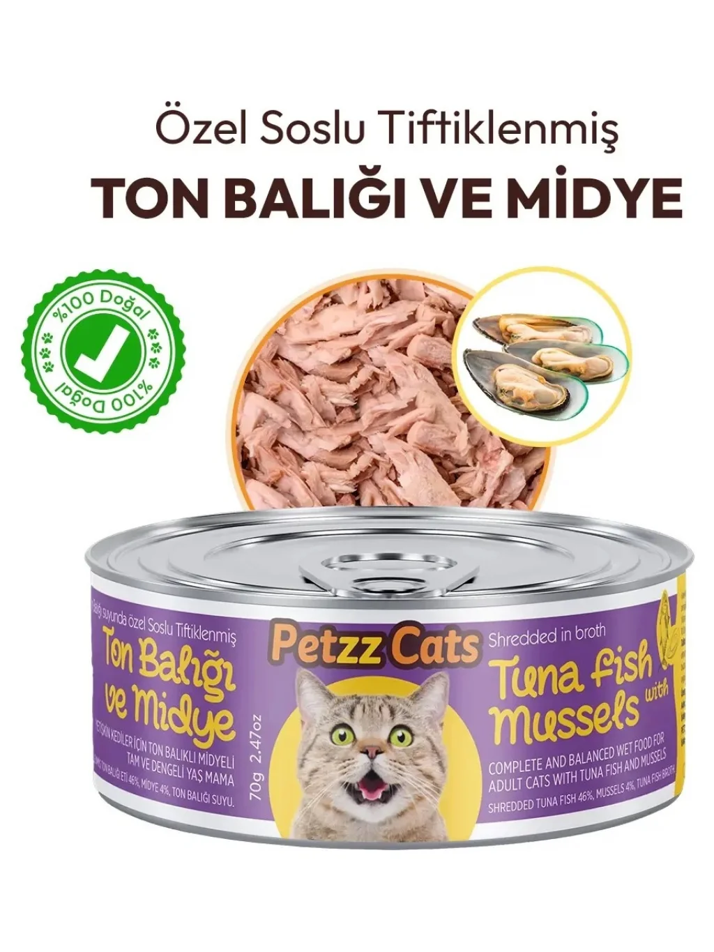 Petzzcats Ton Balığı & Midye Konserve Kedi Maması 1 Adet 70 gr Petzz Cats Ton Balığı ve Midyeli Soslu Tiftiklenmiş Yetişkin Kedi Konservesi 70 g, yetişkin kediler için özel olarak hazırlanmış tam ve dengeli yaş mamadır. Özenle tiftiklenmiş ton balığı parçaları ve midye içeriği, özel sosuyla birleşerek yüksek lezzet ve iştah açıcı bir öğün sunar. Yüksek proteinli içeriği kas gelişimini desteklerken, doğal yapısı sayesinde kolay sindirim sağlar. Yüksek nem oranı kedinizin günlük sıvı ihtiyacını karşılamaya yardımcı olur. Seçici kediler için ideal olan bu formül, günlük ana öğün veya kuru mamaya tamamlayıcı olarak güvenle kullanılabilir. Öne Çıkan Özellikler: