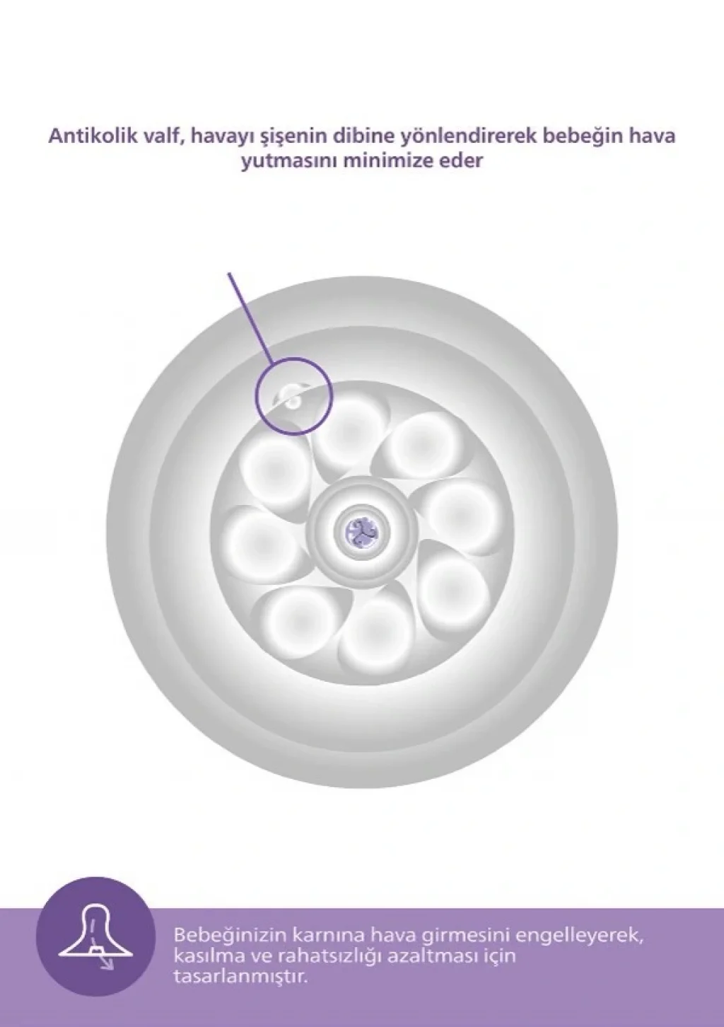 Anti-kolik teknolojisi. Bebeğinizin karnına hava girmesini engelleyerek, kasılma ve rahatsızlığı azaltması için tasarlanmıştır
