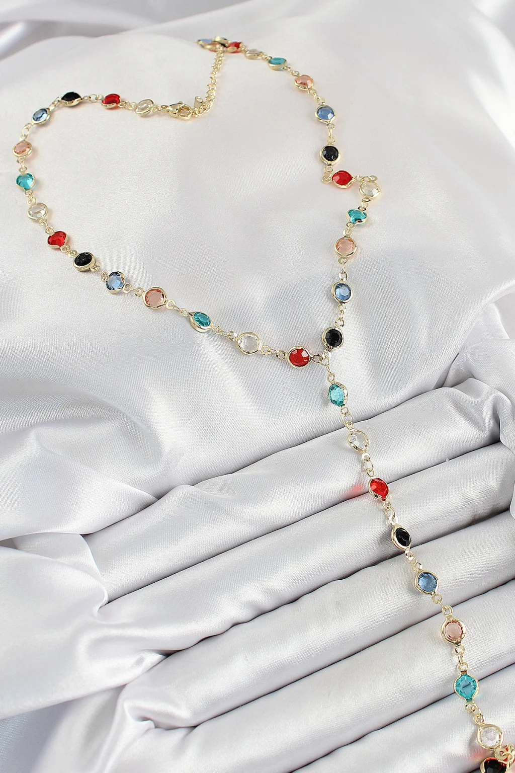 BUĞZ Pirinç Asorti Model Gold Renk Zirkon Taşlı Y Kolye - BUĞZ