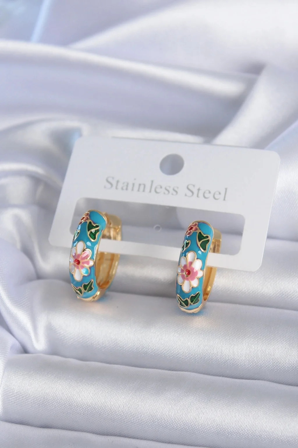 BUĞZ Pirinç Gold Renk Mavi Çiçek İşleme Detay Kadın Küpe