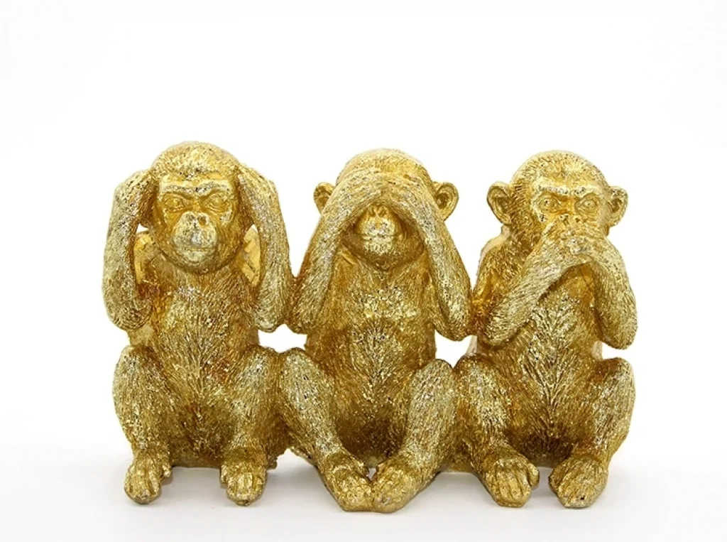 POLYESTER 3 MAYMUN - GÖRMEDİM DUYMADIM BİLMİYORUMÜrün ÖzellikleriPolyester 3 Maymun figürü, "Görmedim, Duymadım, Bilmiyorum" temalı altın renkli dekoratif bir obje olarak tasarlanmıştır. 16x10 cm boyutundaki bu şık figür, anlamlı bir mesaj taşıyan, evde veya ofiste dekoratif amaçla kullanılabilecek zarif bir parçadır. Altın rengi detayları ve polyester malzemesiyle uzun ömürlüdür. Hem koleksiyonluk hem de anlamlı bir hediye olarak ideal bir seçenektir.Paket İçeriği1 Adet Polyester 3 Maymun - Görmedim Duymadım Bilmiyorum