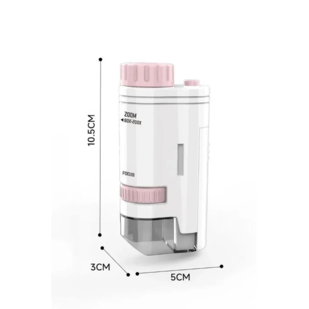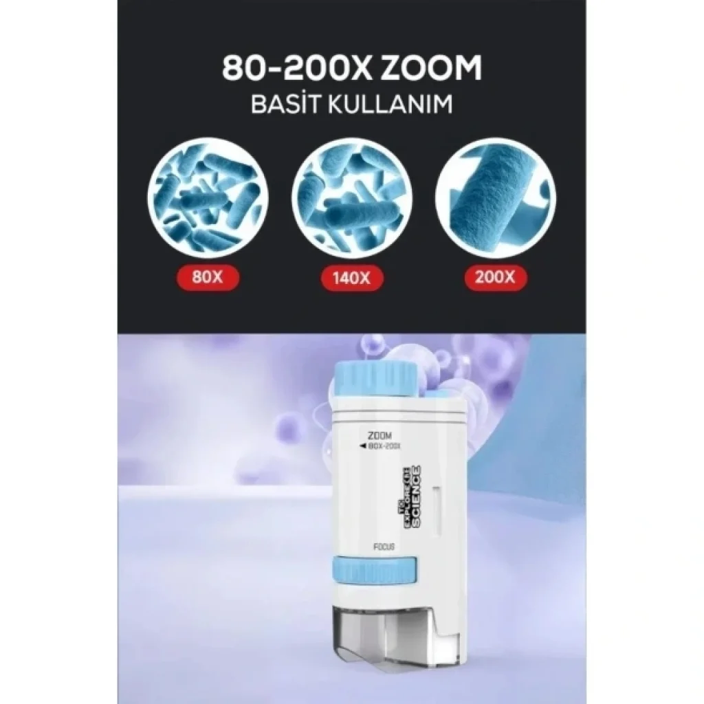 PORTATİF MİNİ MİKROSKOPÜrün ÖzellikleriPortatif mini mikroskop, 10.5 cm x 5 cm x 3 cm boyutlarıyla kompakt ve taşınabilir bir kullanım sunar. 80x ila 200x arasında yakınlaştırma yapabilen zoom özelliği sayesinde detayları net şekilde inceleme imkânı sağlar. Dahili LED aydınlatması sayesinde karanlık ortamlarda bile net görüntü elde edilebilir. Üzerindeki odaklama ve yakınlaştırma ayar düğmeleriyle görüntü kontrolü kolayca yapılabilir. El tipi tasarımı ile okul projeleri, doğa gözlemleri, hobi ve eğitim amaçlı kullanımlar için idealdir. Hafif yapısı sayesinde çantada taşınabilir ve istenilen her yerde anında kullanılabilir. Çocuklar ve yetişkinler için eğlenceli ve öğretici bir üründür.Paket İçeriği1 Adet Portatif Mini Mikroskop