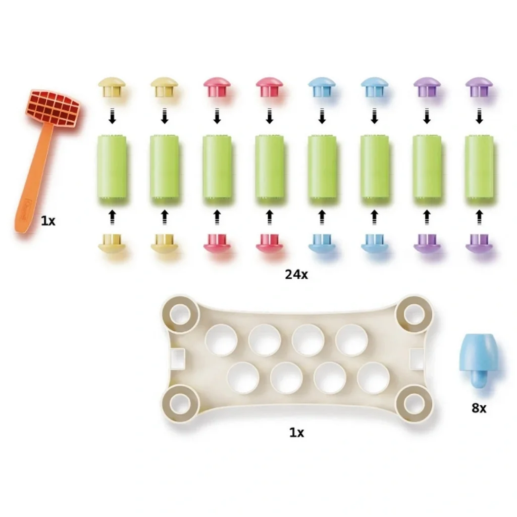 İ.ccedil;indekiler .bull; 1 .ccedil;eki.ccedil; .bull; 8 silindir ve 16 renkli d.uuml;ğmeden oluşan 8 .ccedil;ivi .bull; 1 beyaz taban .bull; 8 renkli mandal ayağı
