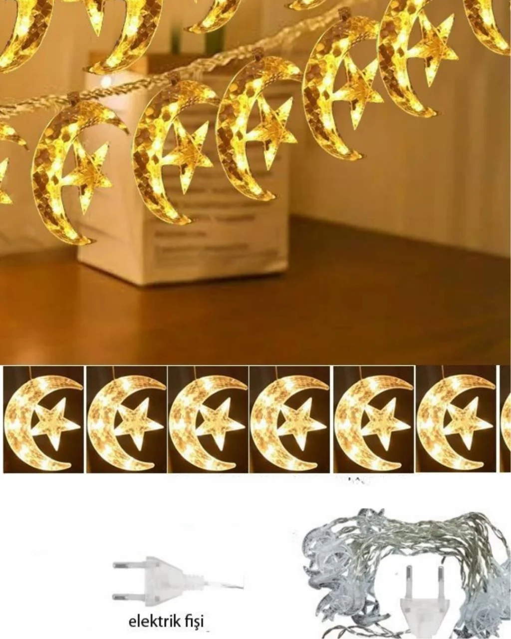 Bu dekoratif hilal ve yıldız perde aydınlatma sistemi, Ramazan, bayram, düğün, nişan, doğum günü ve parti organizasyonları için ideal bir süsleme çözümüdür. Mekâna kattığı sıcak sarı ışık tonu sayesinde hem samimi hem de zarif bir atmosfer oluşturur.İki farklı ışık modu sayesinde ortamın konseptine uygun bir görünüm elde edebilirsiniz. Sabit ışık modu daha klasik ve şık bir ambiyans yaratırken, yanıp sönen mod eğlenceli ve dikkat çekici bir etki oluşturur. Bu özellik, ürünü çok yönlü bir dekorasyon ürünü haline getirir.Dayanıklı plastik figürler ve kaliteli PVC kablo tasarımı uzun ömürlü kullanım sağlar. Güvenli yapısı sayesinde iç mekân kullanımında rahatlıkla tercih edilebilir. Kablo yapısı korumalıdır ve güvenlik ön planda tutularak tasarlanmıştır.Perde önünde, arka plan dekoru olarak, masa arkası süslemede ya da vitrin tasarımında rahatlıkla kullanılabilir. Işık yandığında hilal ve yıldız figürleri daha belirgin hale gelir ve bulunduğu ortama estetik bir derinlik kazandırır.