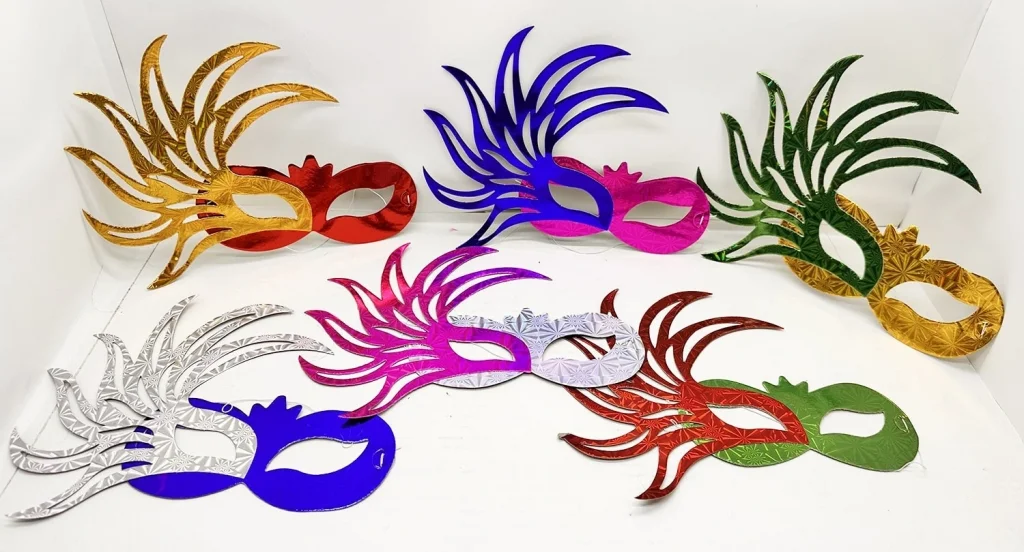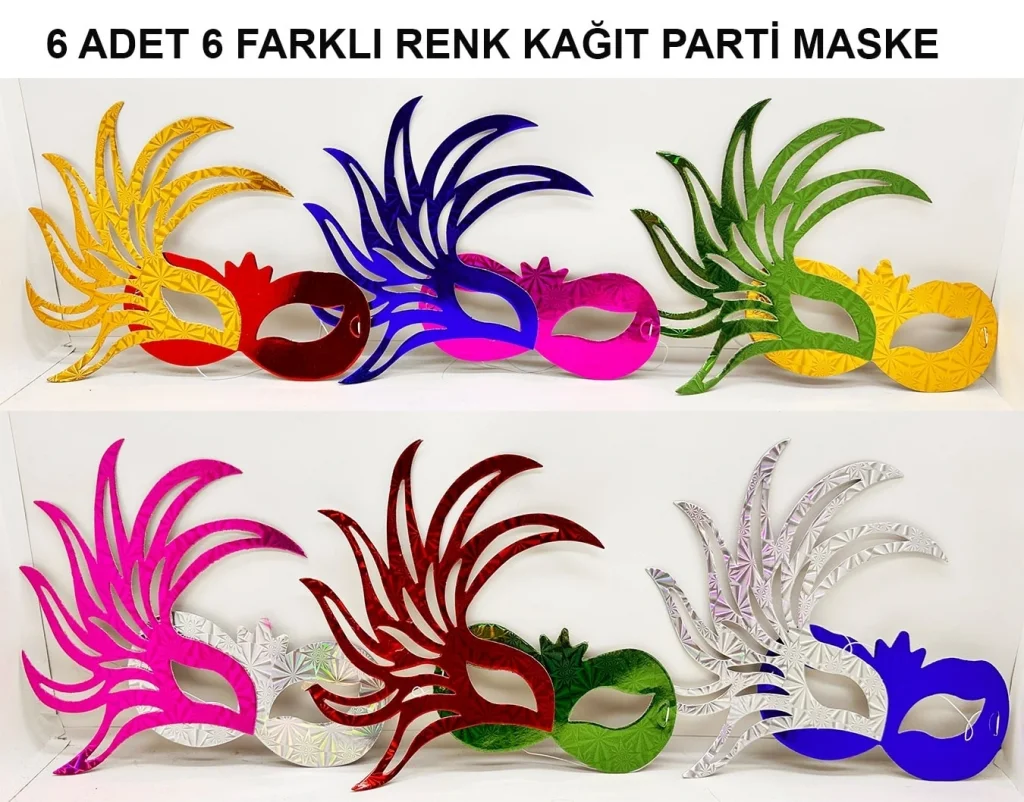 RENGARENK KAĞIT PARTİ BALO MASKESİ 6 ADETÜrün ÖzellikleriRengarenk kağıt parti balo maskesi seti, eğlenceli ve temalı partiler için ideal bir aksesuardır. Hafif ve rahat yapısıyla yüzü rahatsız etmez, elastik ipi sayesinde her yaş grubuna uygundur. Canlı renkleri ve şık tasarımı sayesinde kostüm partileri, maskeli balolar, doğum günü kutlamaları ve özel etkinliklerde dikkat çeker. Tek kullanımlık veya tekrar kullanılabilir şekilde tasarlanmıştır.Paket İçeriği6 Adet Rengarenk Kağıt Parti Balo Maskesi
