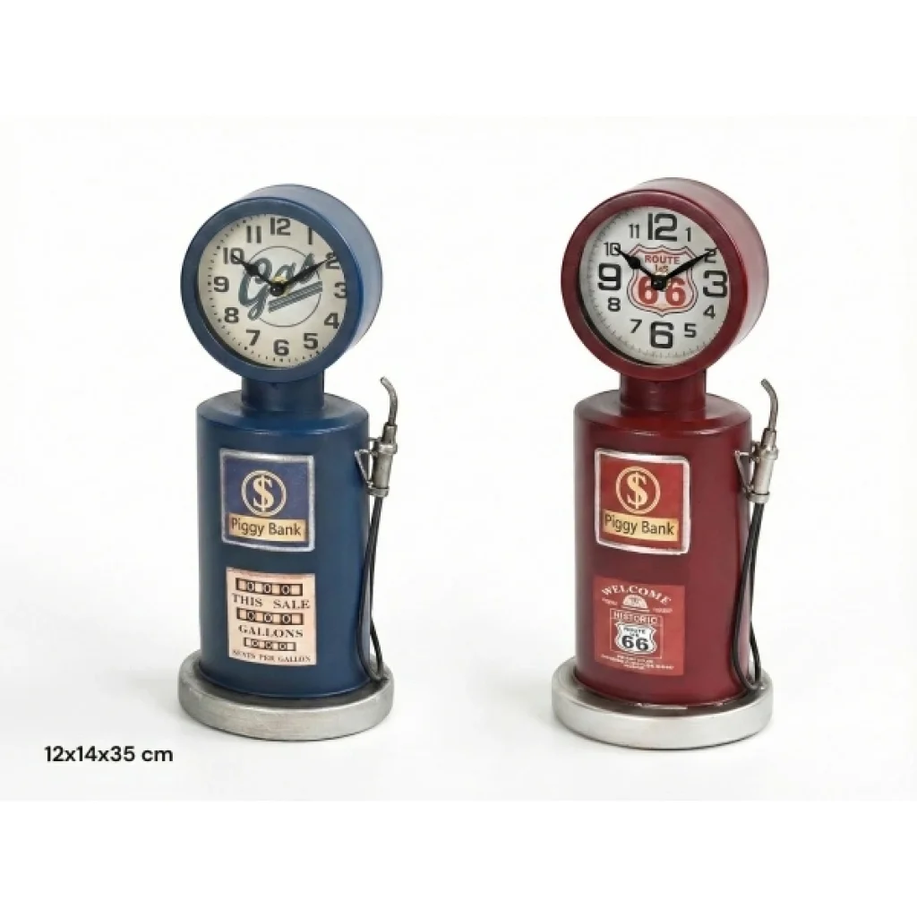 RETRO BENZİN POMPASI TASARIMLI MASAÜSTÜ SAATÜrün ÖzellikleriRetro benzin pompası tasarımlı masaüstü saat, klasik akaryakıt istasyonlarından ilham alan özgün görünümüyle dekoratif masa saati kategorisinde fark yaratan özel bir modeldir. Gövdesinde yer alan pompa formu, hortum detayı ve vintage grafikler sayesinde özellikle retro, endüstriyel ve loft tarzı dekorasyonlara güçlü bir karakter kazandırır. Üst bölümde konumlandırılan yuvarlak kadran, büyük ve net rakamlarıyla saatin kolay okunmasını sağlar ve dekoratif görünümü işlevsellikle birleştirir. 12x14x35 cm ölçüleriyle masa, raf, kitaplık, ofis masası veya vitrin üzerinde dikkat çekici bir duruş sergiler. Sessiz akan mekanizması sayesinde çalışma ve yaşam alanlarında rahatsızlık oluşturmaz. Dayanıklı malzeme yapısı uzun süreli kullanım için uygundur. Renk seçeneği bulunmamaktadır; ürün mavi veya bordo renklerden biri olacak şekilde karışık gönderilmektedir. Hem saat hem de dekoratif obje olarak kullanılabilen bu model, özellikle nostaljik detaylardan hoşlanan kullanıcılar için ideal bir tercihtir.Paket İçeriği1 adet retro benzin pompası tasarımlı masaüstü saat