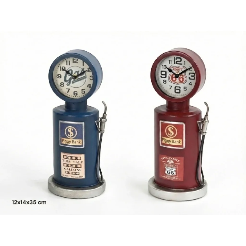 RETRO BENZİN POMPASI TASARIMLI MASAÜSTÜ SAATÜrün ÖzellikleriRetro benzin pompası tasarımlı masaüstü saat, klasik akaryakıt istasyonlarından ilham alan özgün görünümüyle dekoratif masa saati kategorisinde fark yaratan özel bir modeldir. Gövdesinde yer alan pompa formu, hortum detayı ve vintage grafikler sayesinde özellikle retro, endüstriyel ve loft tarzı dekorasyonlara güçlü bir karakter kazandırır. Üst bölümde konumlandırılan yuvarlak kadran, büyük ve net rakamlarıyla saatin kolay okunmasını sağlar ve dekoratif görünümü işlevsellikle birleştirir. 12x14x35 cm ölçüleriyle masa, raf, kitaplık, ofis masası veya vitrin üzerinde dikkat çekici bir duruş sergiler. Sessiz akan mekanizması sayesinde çalışma ve yaşam alanlarında rahatsızlık oluşturmaz. Dayanıklı malzeme yapısı uzun süreli kullanım için uygundur. Renk seçeneği bulunmamaktadır; ürün mavi veya bordo renklerden biri olacak şekilde gönderilmektedir. Hem saat hem de dekoratif obje olarak kullanılabilen bu model, özellikle nostaljik detaylardan hoşlanan kullanıcılar için ideal bir tercihtir.Paket İçeriği1 adet retro benzin pompası tasarımlı masaüstü saat