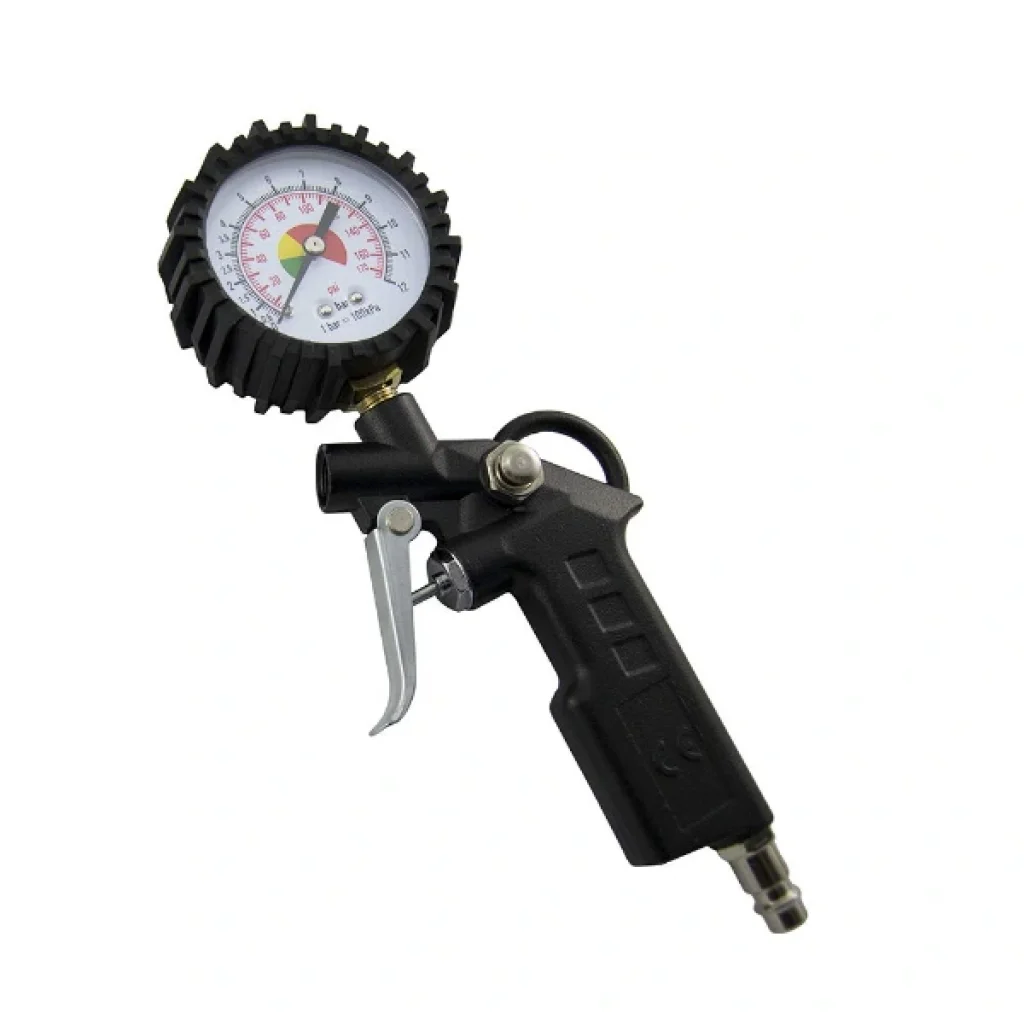 SAATLİ HAVA TABANCASIÜrün ÖzellikleriSaatli hava tabancası, araç lastiklerinin hava basıncını ölçmek ve doğru seviyeye getirmek için profesyonel bir çözümdür. Üzerinde bulunan hassas manometre sayesinde lastik basıncı bar ve psi cinsinden kolayca takip edilebilir. 0-8.5 bar / 0-120 psi ölçüm kapasitesine sahiptir.500 mm hortum uzunluğu ile kullanımda esneklik sağlar. Dayanıklı metal gövdesi ve ergonomik tetiği sayesinde uzun süreli kullanımlarda konfor sunar. Hızlı ve güvenilir hava dolumu için tasarlanmış bu ürün, hem profesyonel servislerde hem de kişisel araç bakımında ideal bir yardımcıdır.Paket İçeriği1 adet saatli hava tabancası